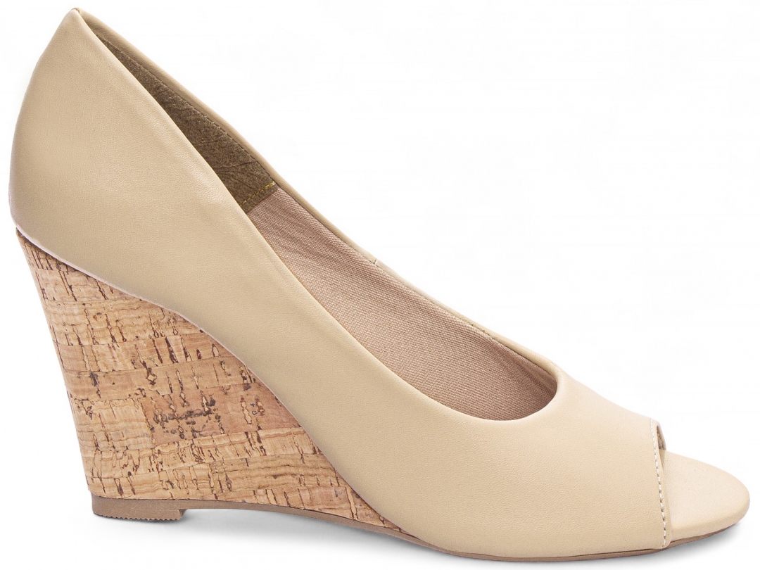 Material: Napa Bege Claro; Palmilha: 4 mm de Espessura, Espuma em EVA, Revestida em Napa Bege Claro e Taloneira Bege Claro; Plataforma: Traseiro / Salto com 8,5 cm de Altura, Revestido em Cortiça; Solado de PVC antiderrapante na cor Bege.