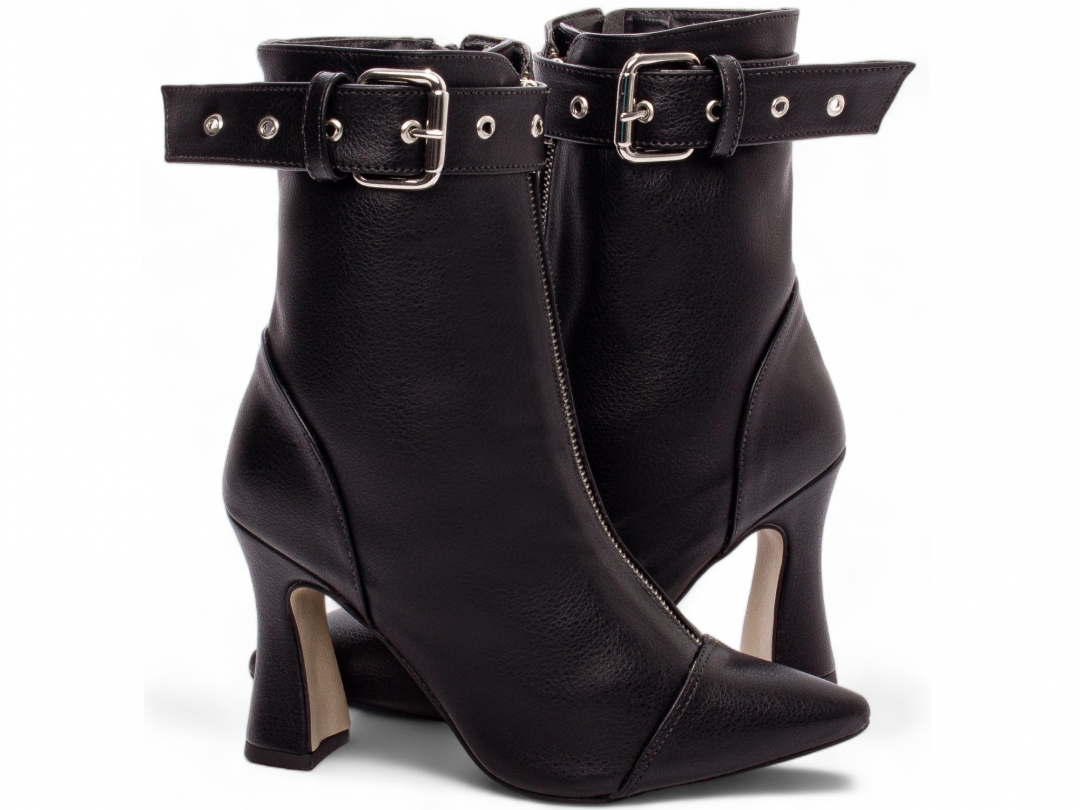 Material: Napa Preto; Enfeites: Zíper na Cor Preto (lateral interna) fivela, Zíper e ilhós na cor Prata; Palmilha: 8 mm de Espessura, Espuma em EVA, e Taloneira Napa Preto; Forro: Cacharrel, material espumado para maior conforto, na cor Preto; Salto: 9 cm de Altura e Revestido em Napa Preto; Solado em Micro na cor Bege.