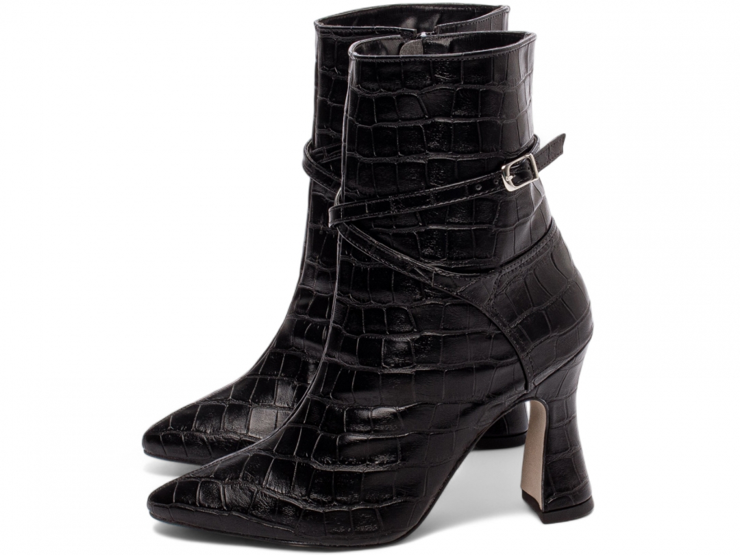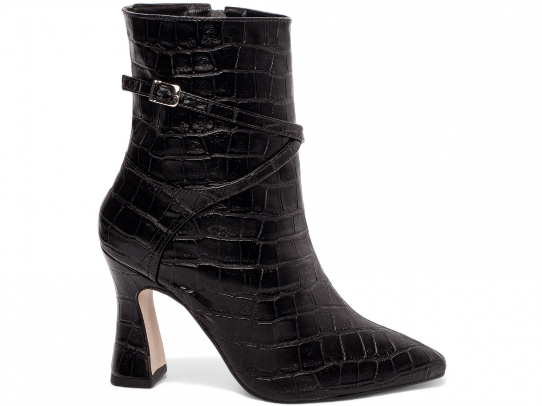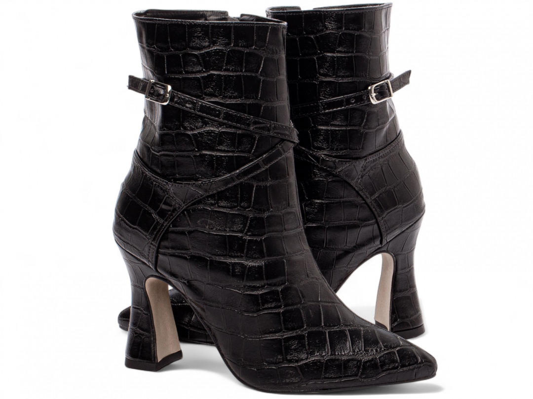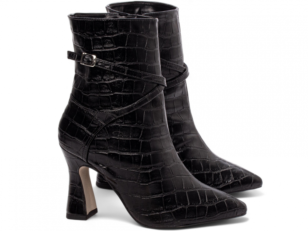 Material: Napa Croco Preto; Enfeites: Zíper na Cor Preto (lateral interna) fivela na cor Prata; Palmilha: 8 mm de Espessura, Espuma em EVA, e Taloneira Napa Preto; Forro: Cacharrel, material espumado para maior conforto, na cor Preto; Salto: 9 cm de Altura e Revestido em Napa Croco Preto; Solado em Micro na cor Bege.