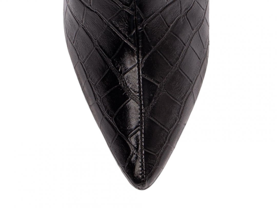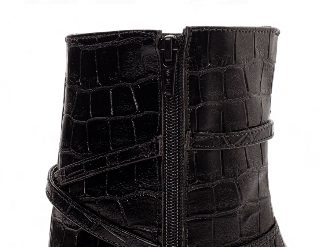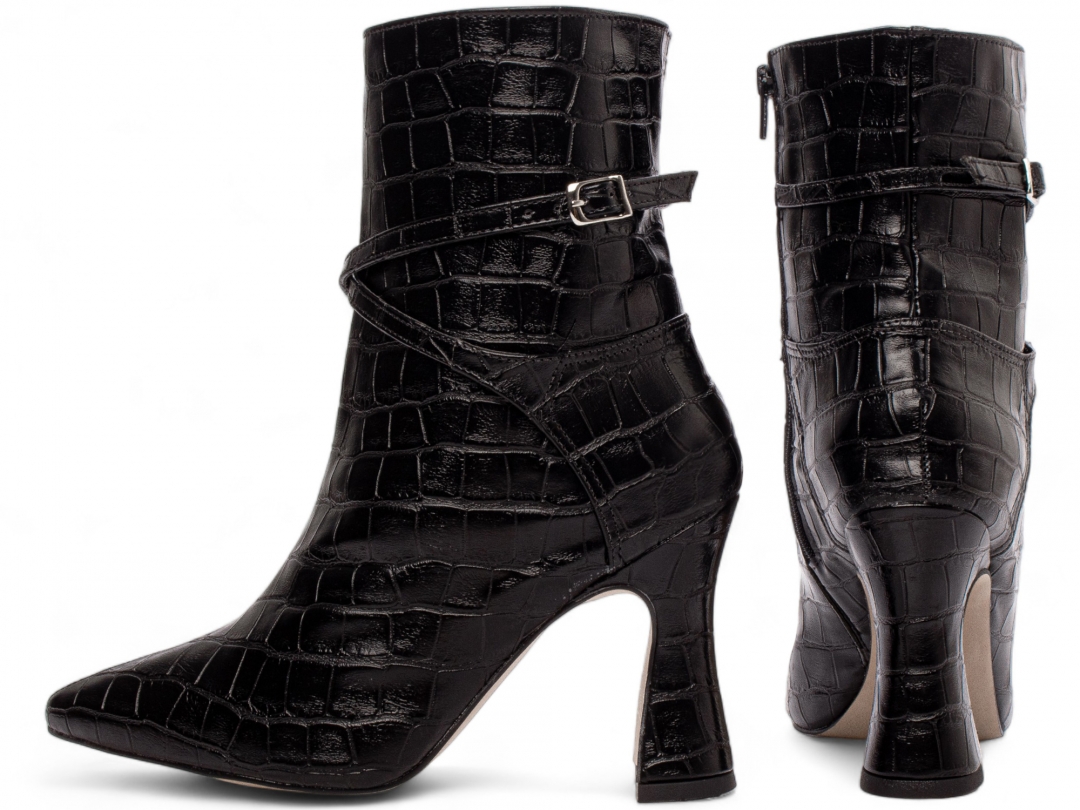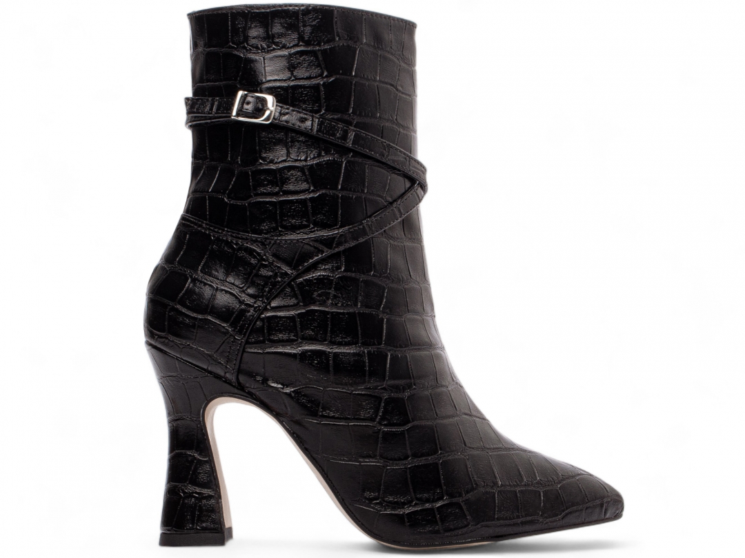 Material: Napa Croco Preto; Enfeites: Zíper na Cor Preto (lateral interna) fivela na cor Prata; Palmilha: 8 mm de Espessura, Espuma em EVA, e Taloneira Napa Preto; Forro: Cacharrel, material espumado para maior conforto, na cor Preto; Salto: 9 cm de Altura e Revestido em Napa Croco Preto; Solado em Micro na cor Bege.