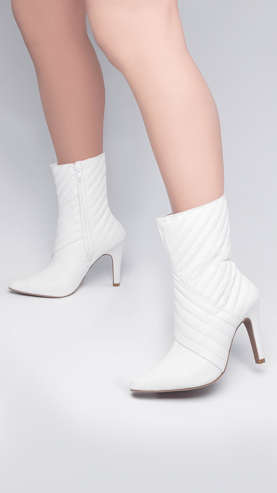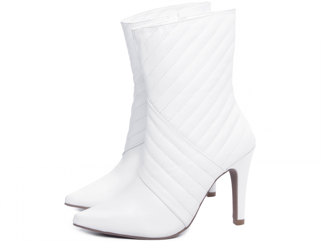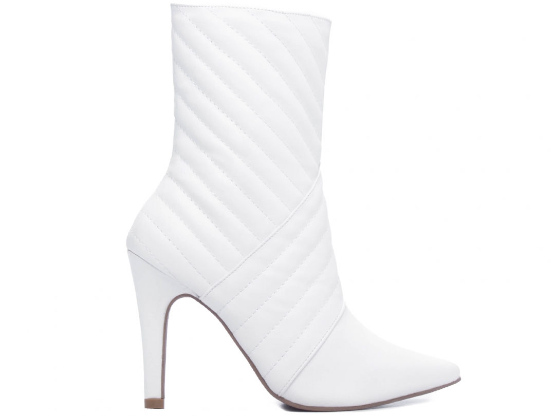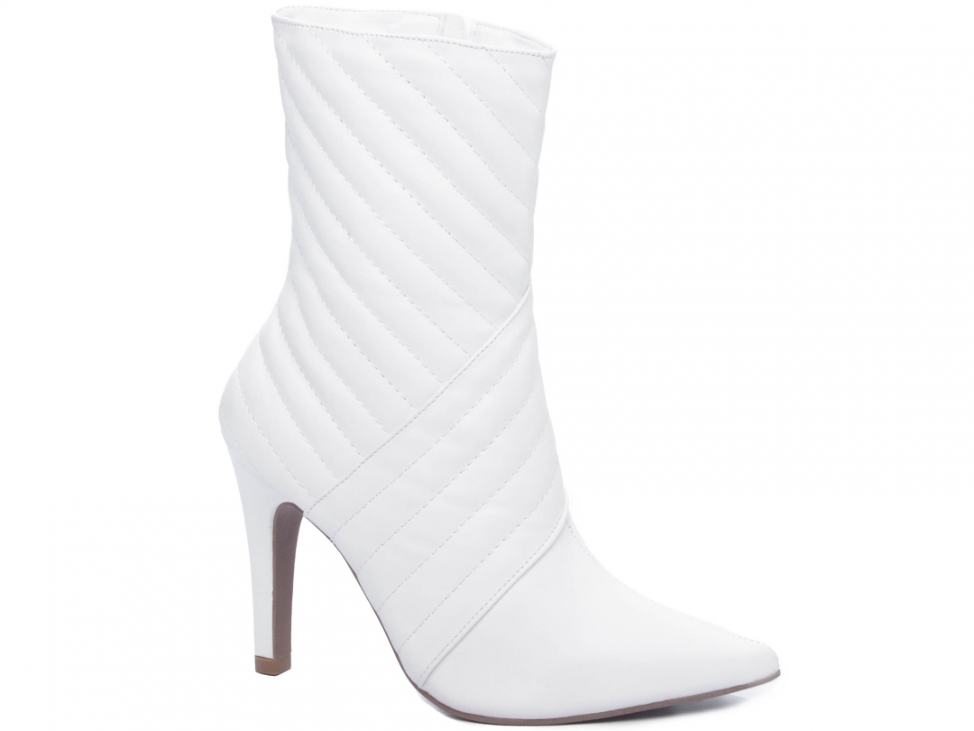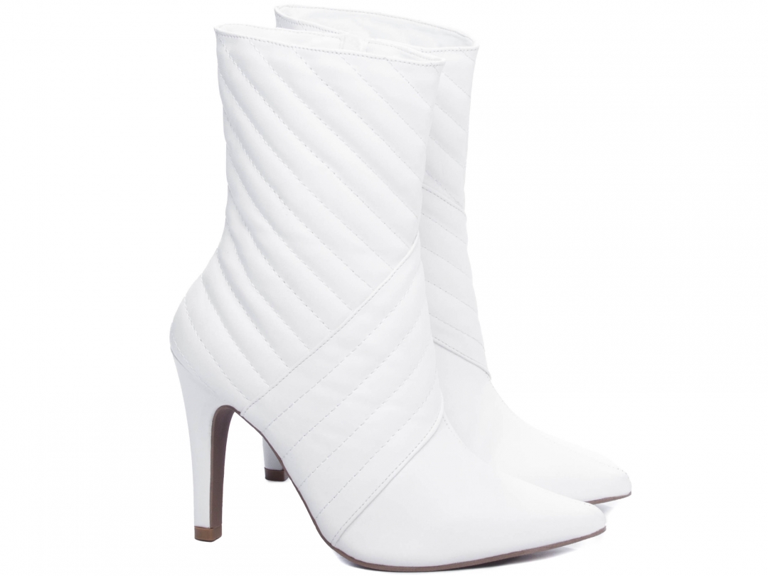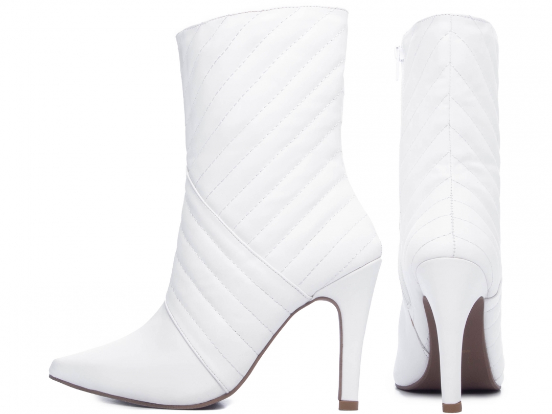 Material: Napa Branco e Matelassê Branco; Enfeites: Detalhes em costuras matelassê e zíper na lateral interna; Palmilha: 8 mm de Espessura, Espuma em EVA, e Taloneira Napa Preto; Forro: Cacharrel, material espumado para maior conforto, na cor Branco; Salto: 10 cm de Altura e Revestido em Napa Branco; Solado de TR na cor Bege.