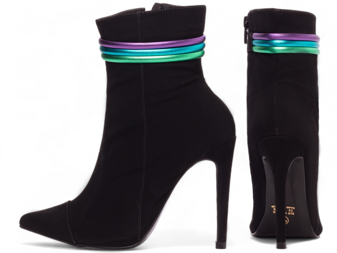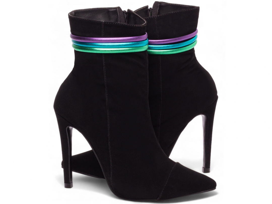 Material: Nobuck Preto; Enfeites: Zíper na Cor Preto (lateral interna) e tiras em Colorido; Palmilha: 8 mm de Espessura, Espuma em EVA, e Taloneira Napa Preto; Forro: Cacharrel, material espumado para maior conforto, na cor Preto; Salto: 12 cm de Altura e Revestido em Nobuck Preto; Solado em Micro na cor Preto.