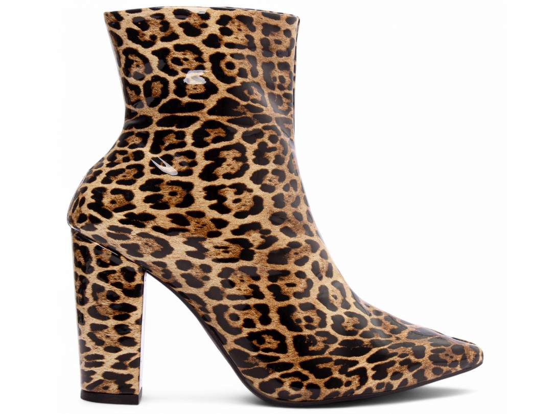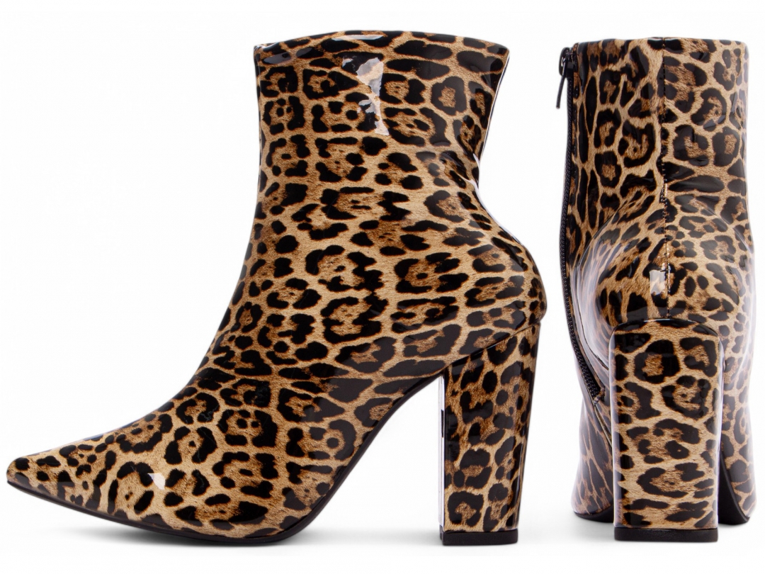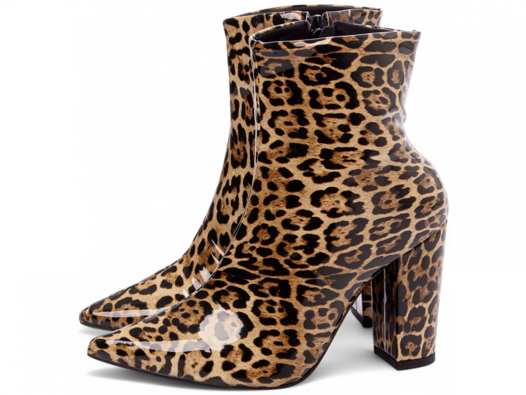 Material: Verniz Onça; Enfeites: Zíper na cor Preto (lateral interna); Palmilha: 8 mm de Espessura, Espuma em EVA, e Taloneira Napa Preto; Forro: Cacharrel, material espumado para maior conforto na cor Preto; Salto: 9 cm de Altura encapado em Verniz Onça; Solado de PVC na cor Preto.