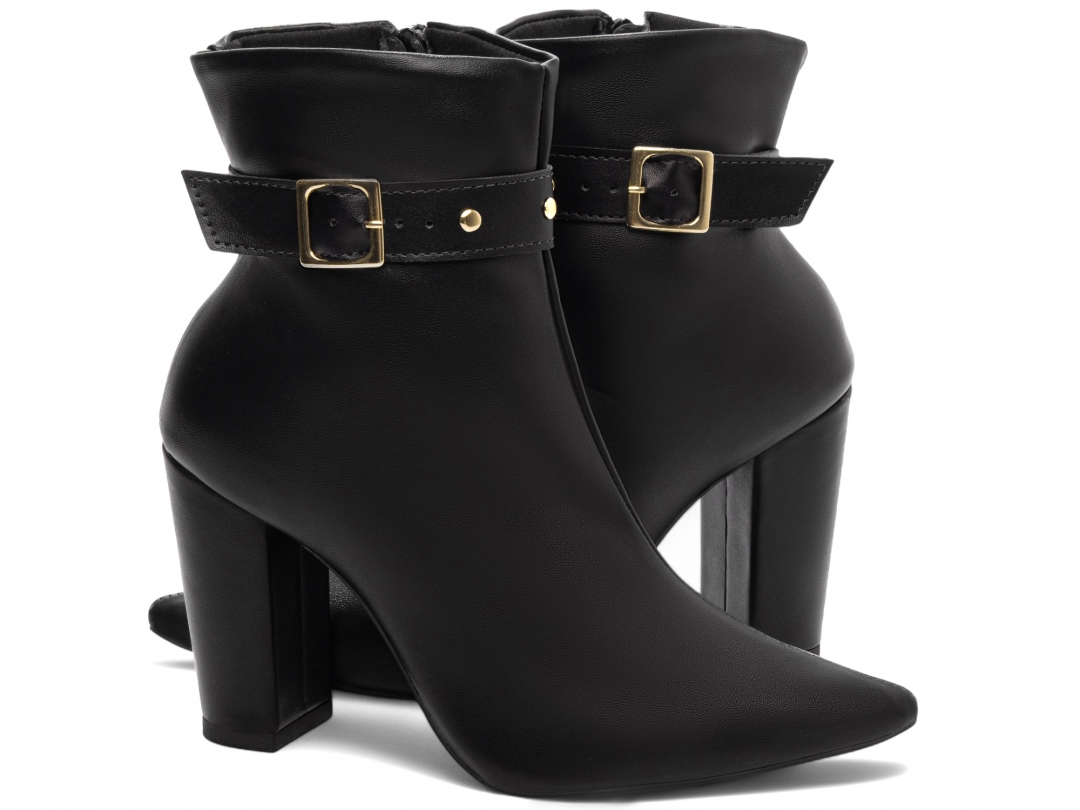 Material: Napa Preto; Enfeites: Zíper na cor Preto (lateral interna) Fivela e Apliques na cor Dourado; Palmilha: 8 mm de Espessura, Espuma em EVA, e Taloneira Napa Preto; Forro: Cacharrel, material espumado para maior conforto na cor Preto; Salto: 9 cm de Altura encapado em Napa Preto; Solado de PVC na cor Preto.
