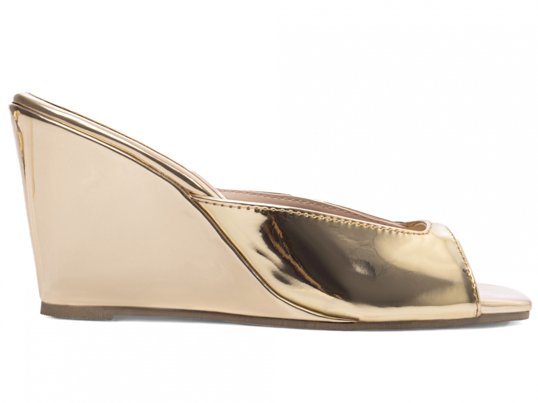 Material: Verniz Metalizado Specchio Ouro Light; Palmilha: 8 mm de Espessura, Espuma em EVA, Revestida em Verniz Metalizado Specchio Ouro Light; e Taloneira Napa Bege; Salto: Cunha com 7 cm de altura revestida em Verniz Metalizado Specchio Ouro Light; Solado de TR com antiderrapante na cor Bege.