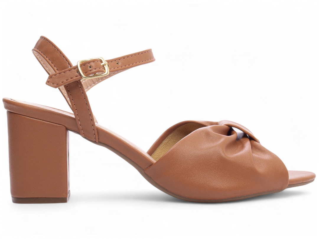 Material: Napa Caramelo; Enfeite: Fivela de ajuste na cor Dourado; Forro: Napa na cor Bege; Palmilha: 8 mm de Espessura, Espuma em EVA, Revestida em Napa Caramelo e Taloneira Napa Bege; Salto: Grosso com 6 cm de Altura Revestido em Napa Caramelo; Solado de PVC com antiderrapante na cor Bege.