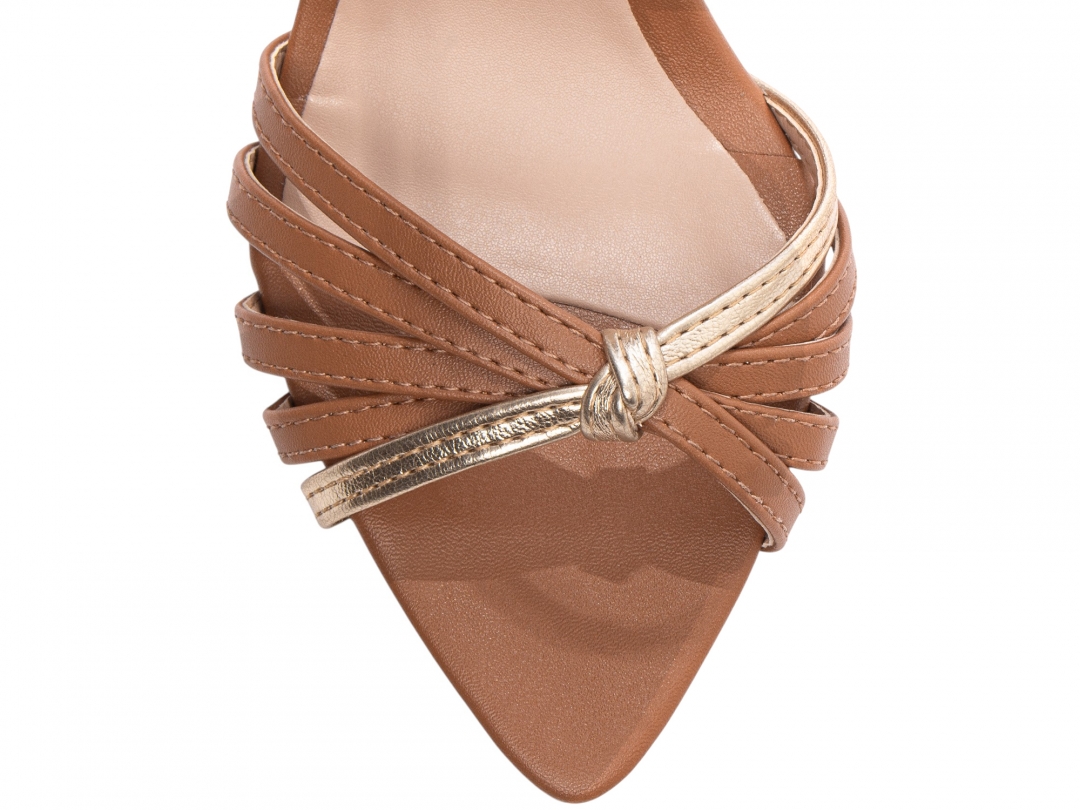 Material: Napa Caramelo e Napa Metalizado Ouro Light; Palmilha: 8 mm de Espessura, Espuma em EVA, Revestida em Napa Caramelo e Taloneira Napa Bege; Enfeite: Fivela de Ajuste na cor Dourado; Salto: Fino com 9 cm de Altura Pintado na cor Caramelo; Solado de PVC com antiderrapante na cor Bege.