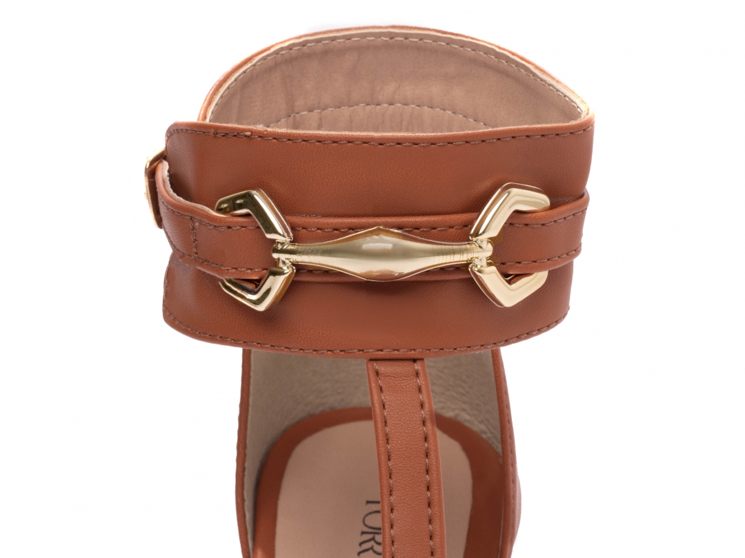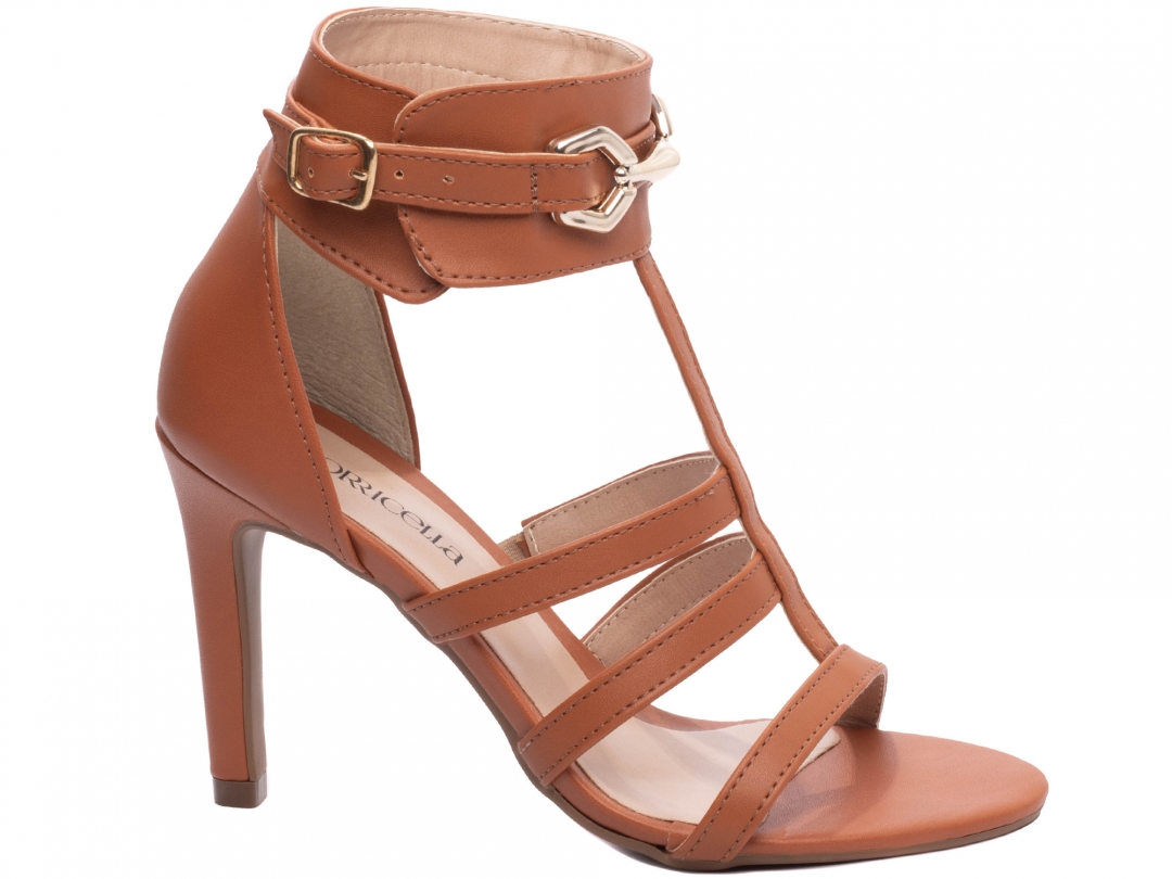 Material: Napa Caramelo; Palmilha: 8 mm de Espessura, Espuma em EVA, Revestida em Napa Caramelo e Taloneira Napa Bege; Enfeite: Fivela de Ajuste na Cor Dourado e enfeite em ABS na cor Dourado; Salto: 9,5 cm de Altura Revestido em Napa Caramelo; Solado de TR na cor Bege.