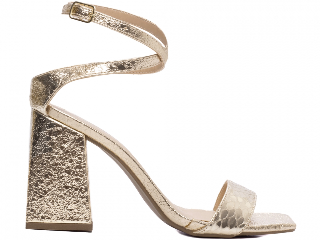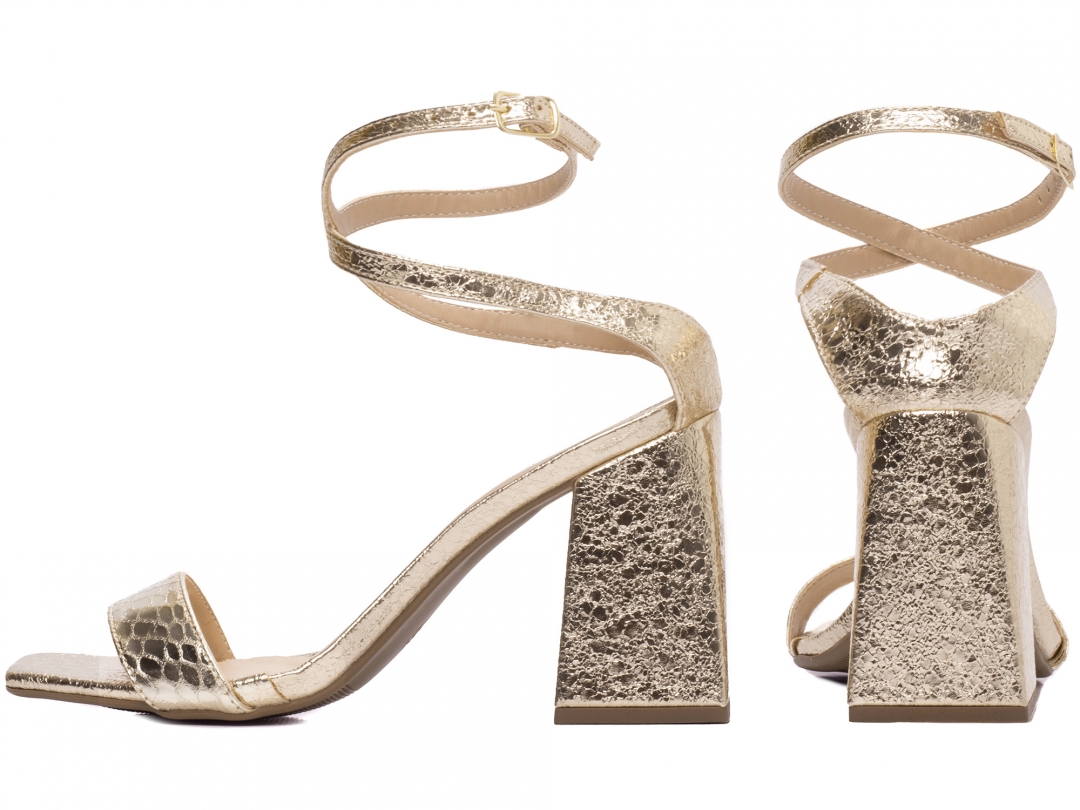 Material: Napa Metalizado Dourado; Enfeite: Fivela de Ajuste na cor Dourado; Palmilha: 8 mm de Espessura, Espuma em EVA, Revestida em Napa Metalizado Dourado e Taloneira Napa Bege; Salto: Grosso com 9 cm de Altura Revestido em Napa Metalizado Dourado; Solado de TR com antiderrapante na cor Bege.