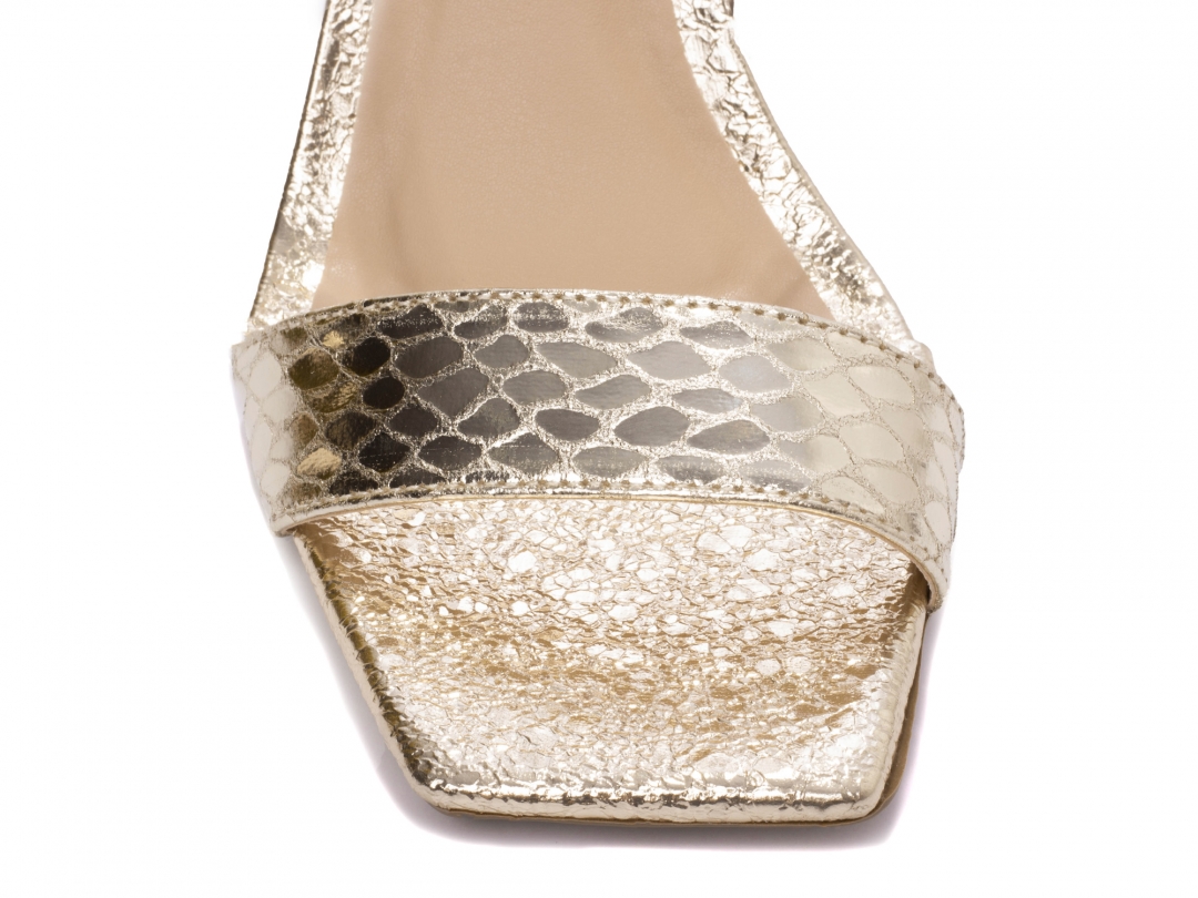 Palmilha: 8 mm de Espessura, Espuma em EVA, Revestida em Napa Metalizado Dourado e Taloneira Napa Bege;
