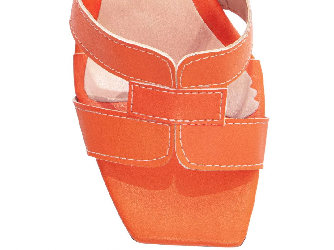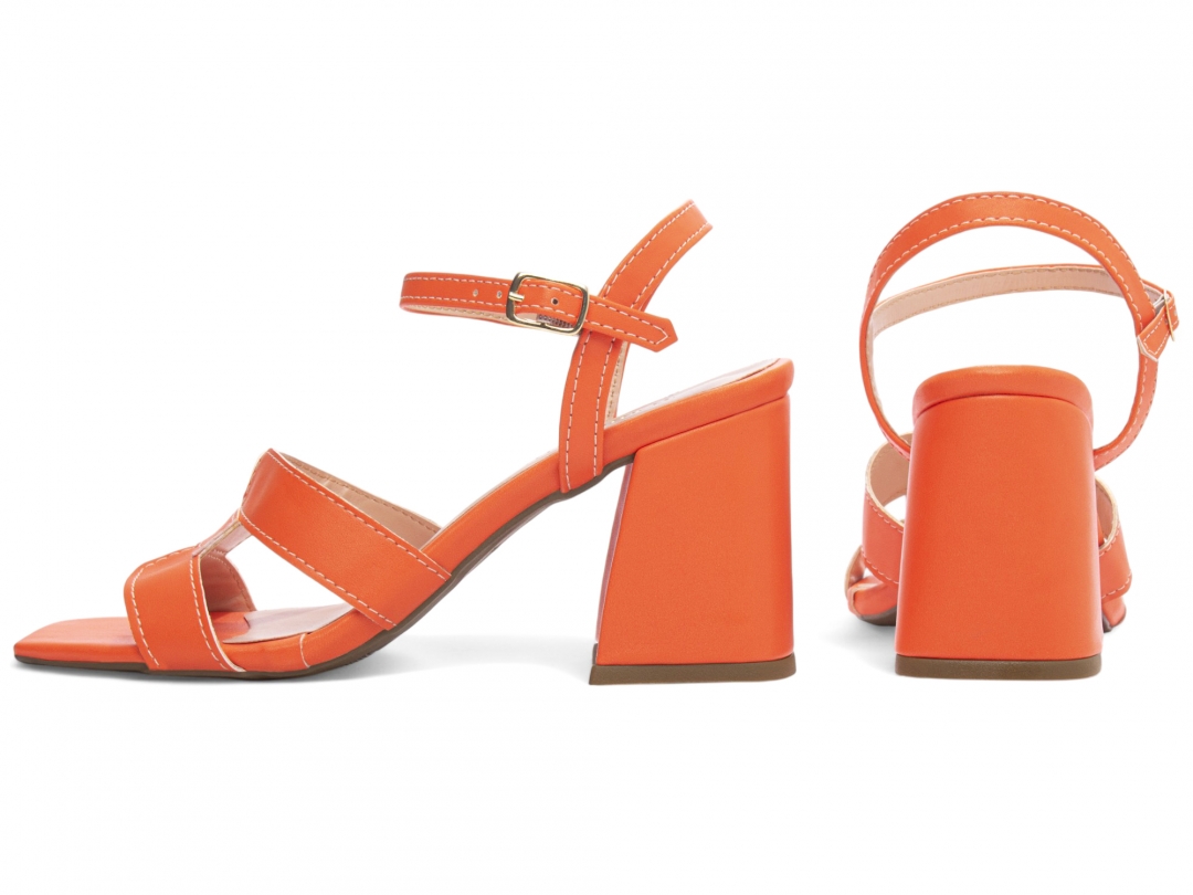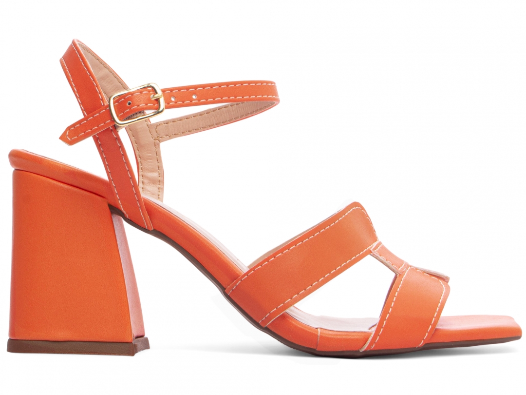 Material: Napa Laranja; Enfeite: Fivela de Ajuste na cor Dourado; Palmilha: 8 mm de Espessura, Espuma em EVA, Revestida em Napa Laranja e Taloneira Napa Bege; Salto: Grosso com 7 cm de Altura Revestido em Napa Laranja; Solado de PVC com antiderrapante na cor Bege.