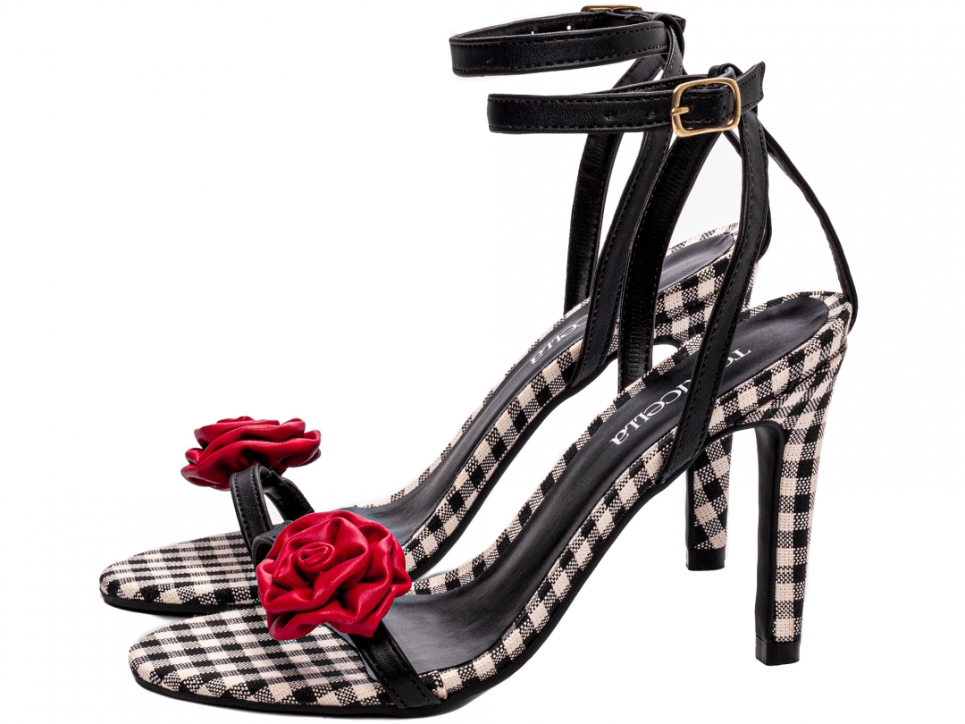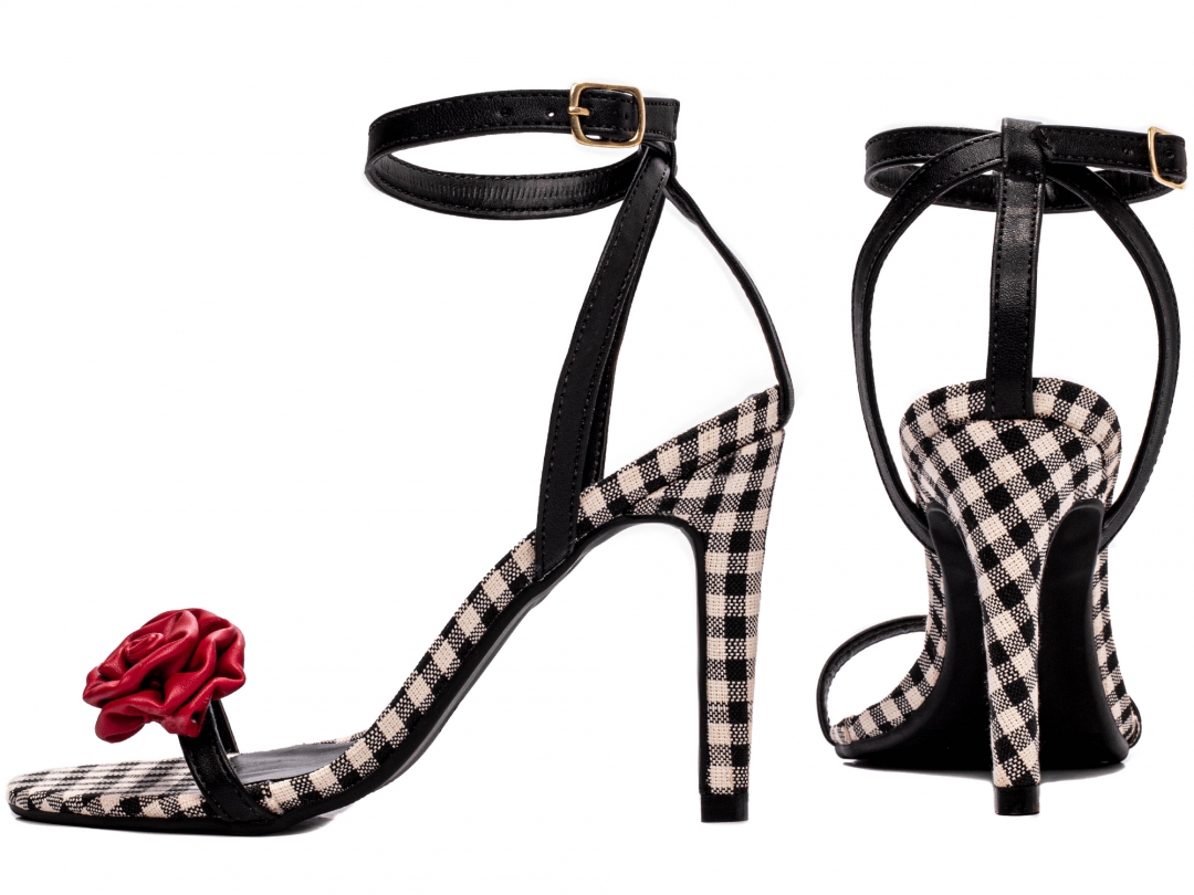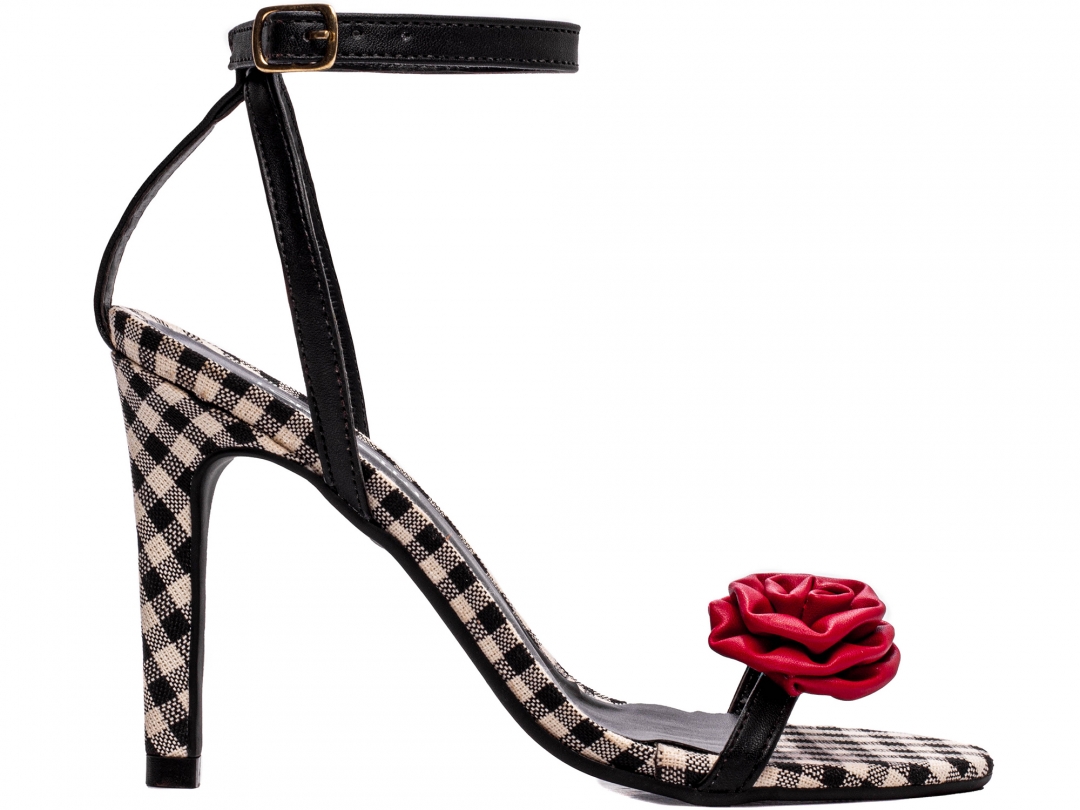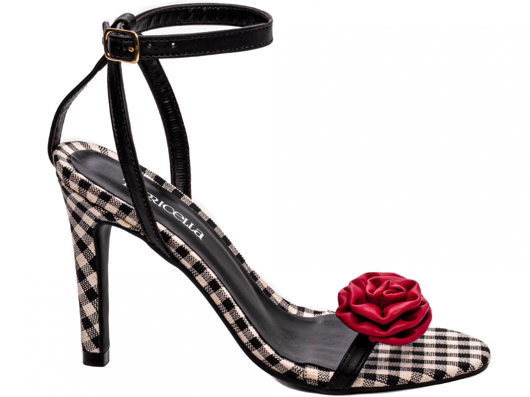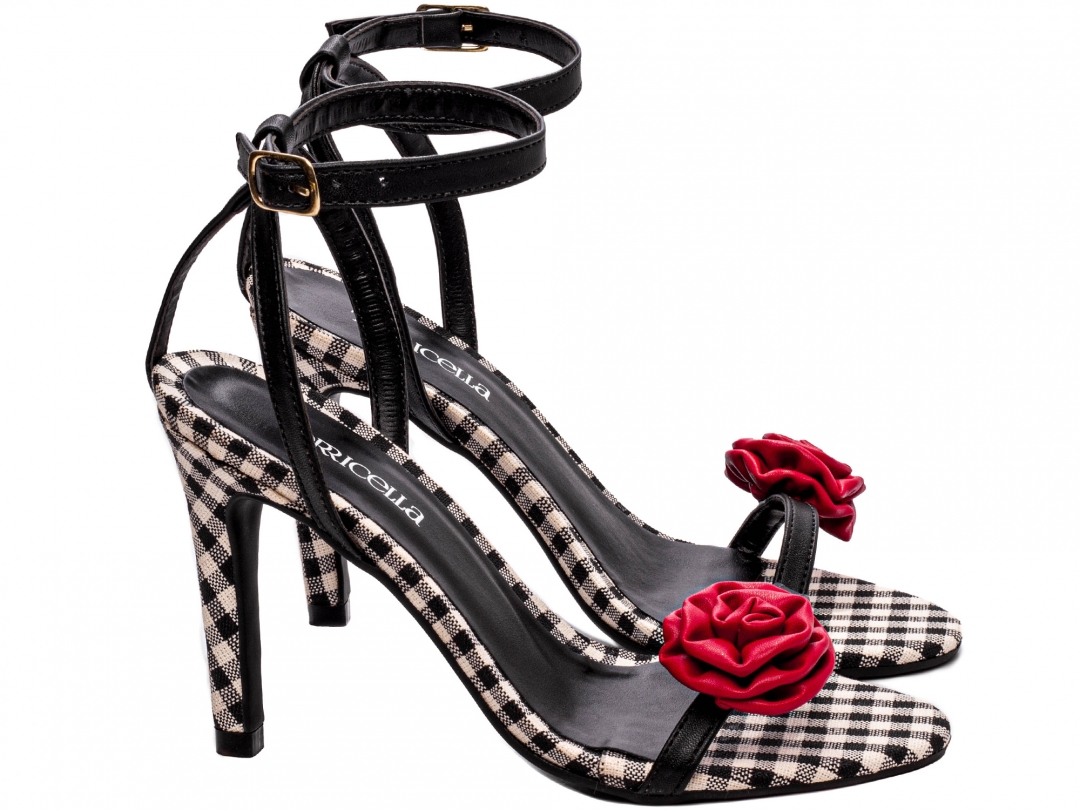 Material: Napa Preto; Palmilha: 8 mm de Espessura, Espuma em EVA, Revestida em Tecido Xadrez Preto e Branco e Taloneira Napa Preto; Enfeite: Fivela de Ajuste na Cor Dourado e Flor em Napa Vermelho; Salto: 9,5 cm de Altura Revestido em Tecido Xadrez Preto e Branco; Solado de TR na cor Preto.