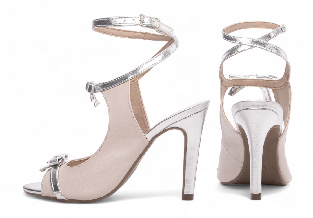 Palmilha: 8 mm de Espessura, Espuma em EVA, Revestida em Napa Metalizado Prata e Taloneira Napa Bege;