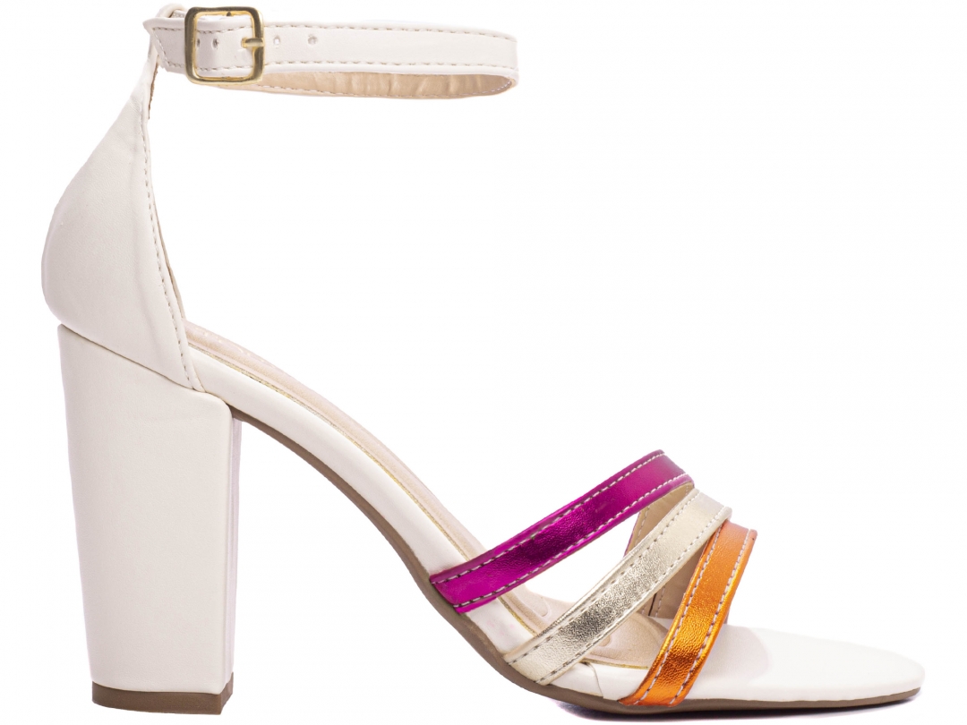 Material: Napa Metalizado Laranja, Ouro Light, Pink e Napa Off White; Enfeite: Fivela de Ajuste na Cor Dourada; Forro: Napa na cor Bege; Palmilha: 8 mm de Espessura, Espuma em EVA, Revestida em Napa Off White e Taloneira Napa Bege; Salto: Grosso com 8,5 cm de Altura Revestido em Napa Off White; Solado de PVC […]