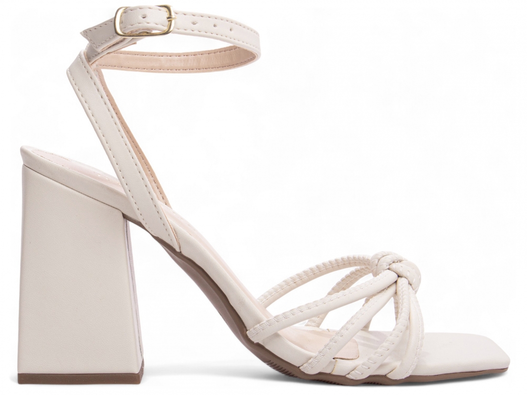 Material: Napa Off White; Enfeite: Fivela de Ajuste na cor Dourado; Palmilha: 8 mm de Espessura, Espuma em EVA, Revestida em Napa Off White e Taloneira Napa Bege; Salto: Grosso com 9 cm de Altura Revestido em Napa Off White; Solado de TR com antiderrapante na cor Bege.