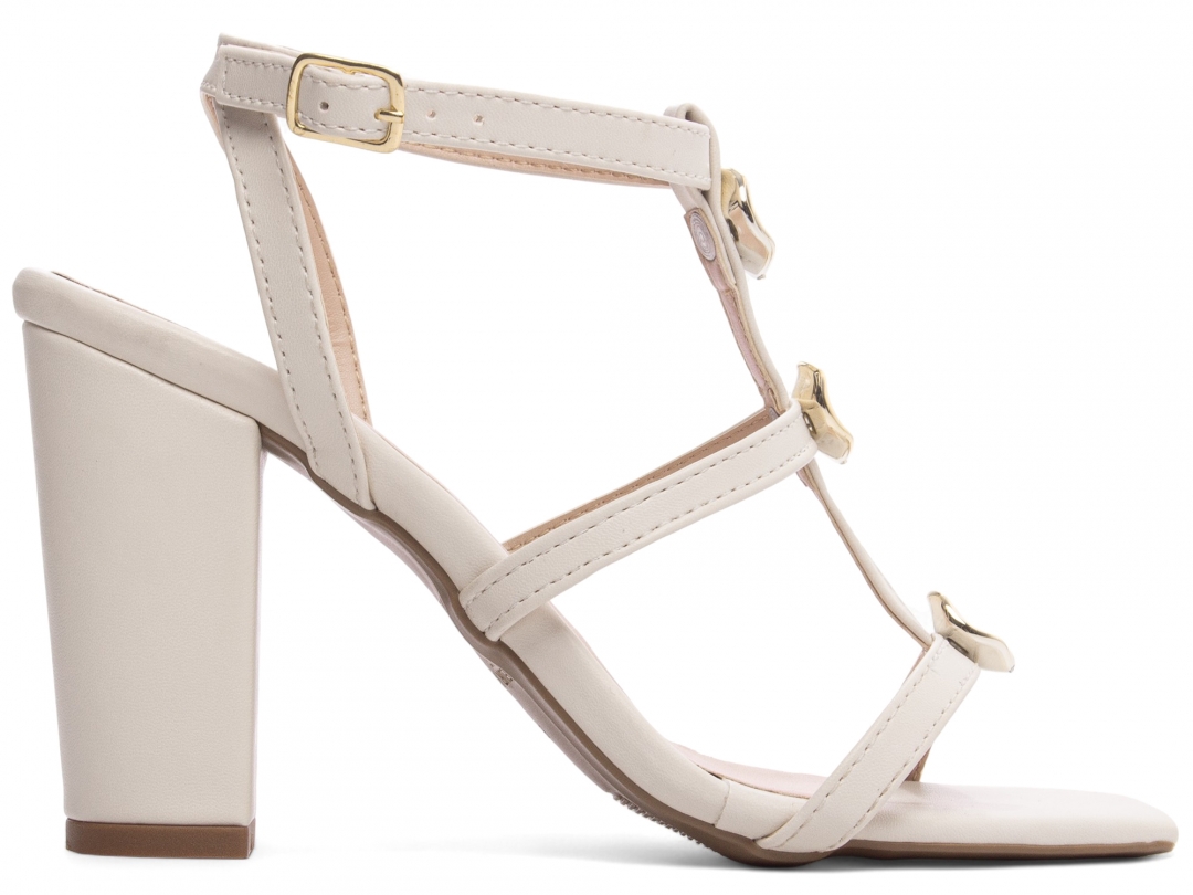 Material: Napa Off White; Enfeite: Apliques em ABS na cor Dourado e Fivela de Ajuste na Cor Dourado; Palmilha: 8 mm de Espessura, Espuma em EVA, Revestida em Napa Off White e Taloneira Napa Bege; Salto: Grosso com 9 cm de Altura Revestido em Napa Off White; Solado de TR com antiderrapante na cor Bege.