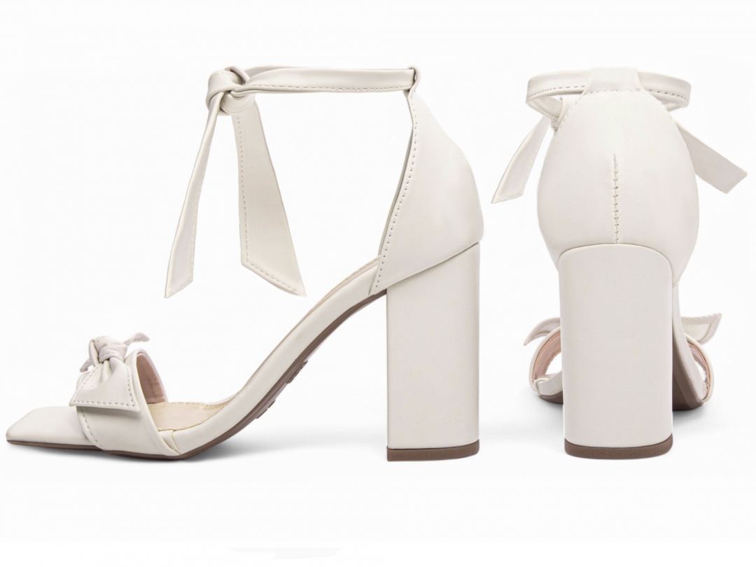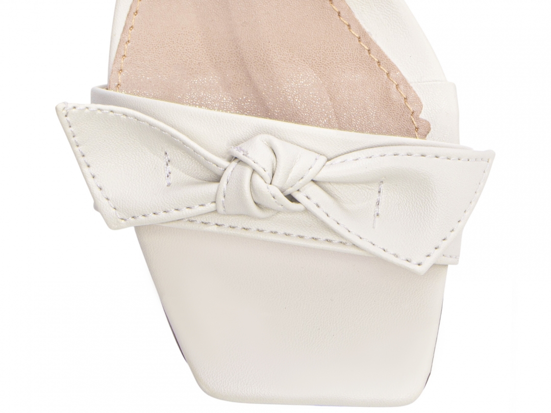 Material: Napa Off White; Enfeite: Tira Laço Nó em Napa Off White e Laço em Napa Off White; Palmilha: 8 mm de Espessura, Espuma em EVA, Revestida em Napa Off White e Taloneira Napa Bege; Salto: 8,5 cm de Altura e Revestido em Napa Off White; Solado de PVC com antiderrapante na cor Bege.