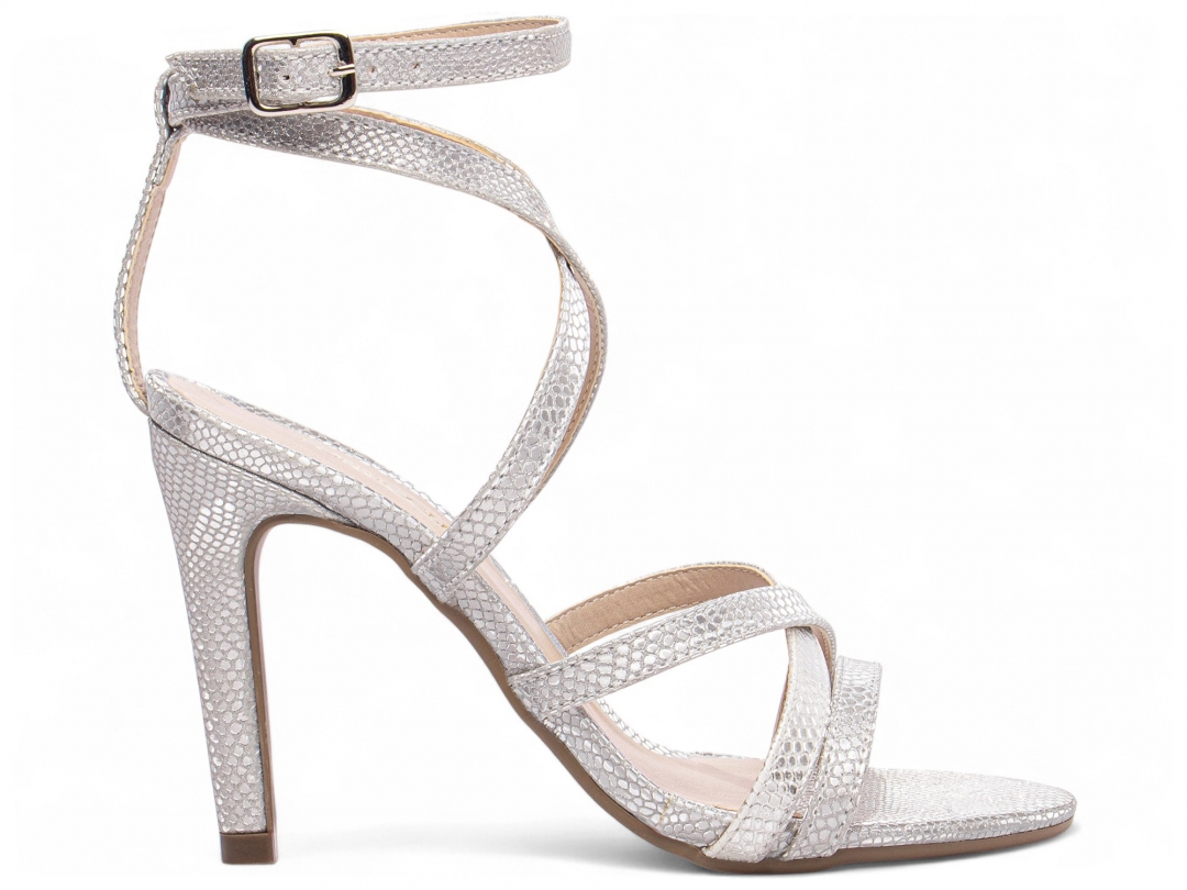 Material: Croco Metalizado Prata; Palmilha: 8 mm de Espessura, Espuma em EVA, Revestida em Croco Metalizado Prata e Taloneira Napa Bege; Enfeite: Fivela de Ajuste na Cor Prata; Salto: Fino com 9,5 cm de Altura Croco Metalizado Prata; Solado de TR na cor Bege.