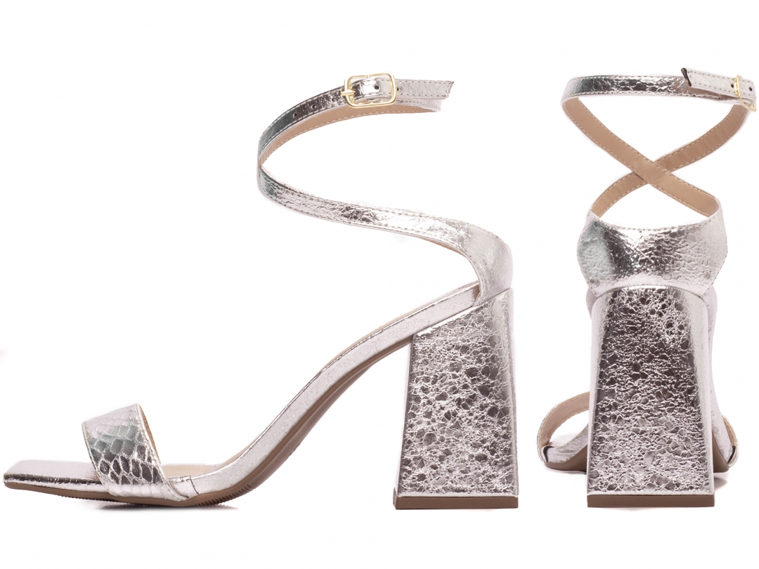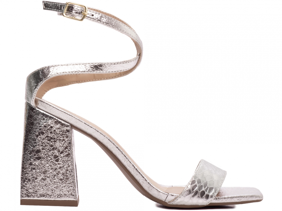 Material: Napa Metalizado Prata; Enfeite: Fivela de Ajuste na cor Dourado; Palmilha: 8 mm de Espessura, Espuma em EVA, Revestida em Napa Metalizado Prata e Taloneira Napa Bege; Salto: Grosso com 9 cm de Altura Revestido em Napa Metalizado Prata; Solado de TR com antiderrapante na cor Bege.