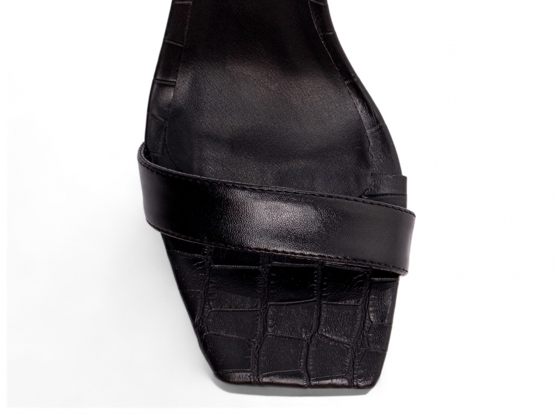Palmilha: 8 mm de Espessura, Espuma em EVA, Revestida em Napa Croco Preto e Taloneira Napa Preto;