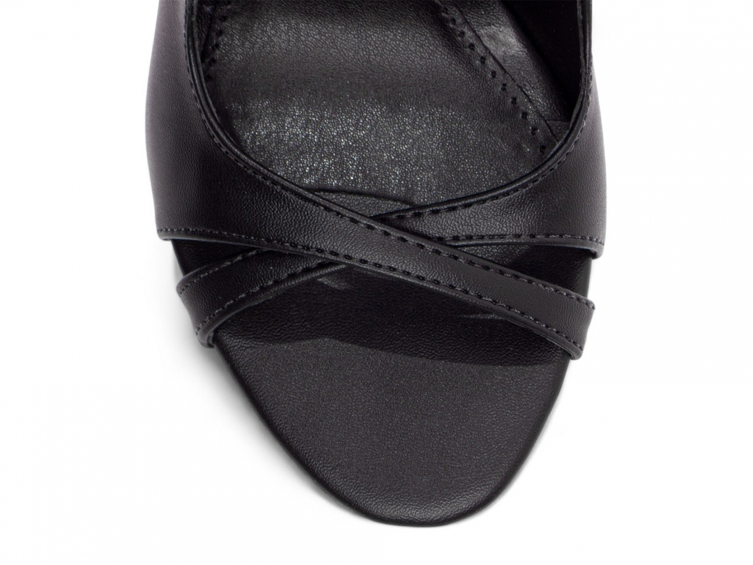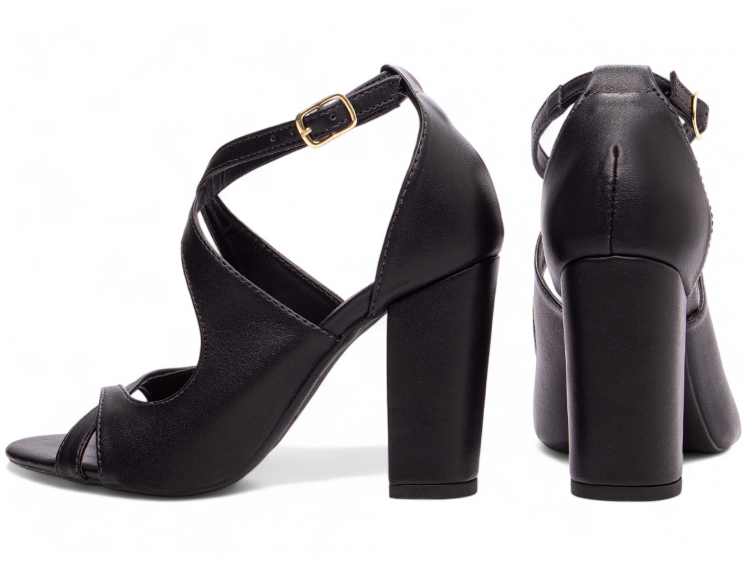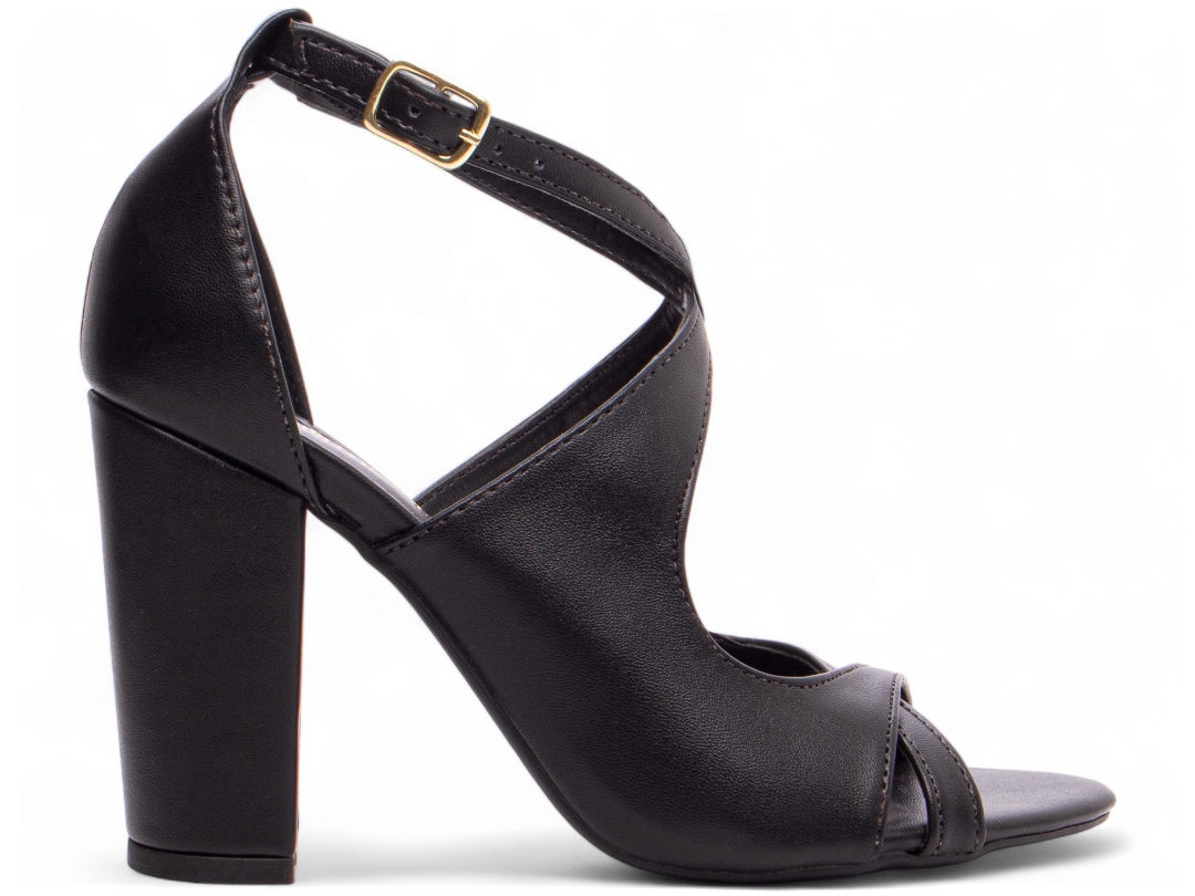 Material: Napa Preto; Palmilha: Confort com 8 mm de Espessura, Espuma em EVA, Revestida com Napa Preto e Taloneira em Napa Preto; Enfeite: Fivela de Ajuste na Cor Dourado; Forro: Sintético na cor Preto; Salto: 8,5 cm de altura Revestido em Napa Preto; Solado de PVC antiderrapante na cor Preto.