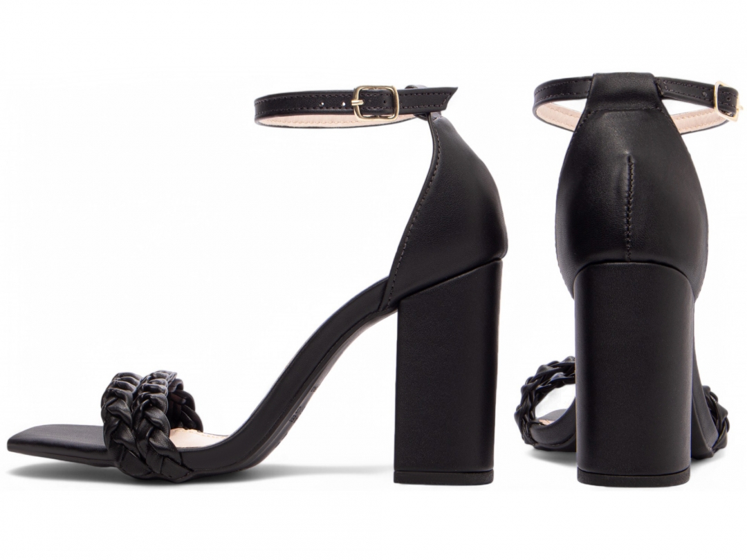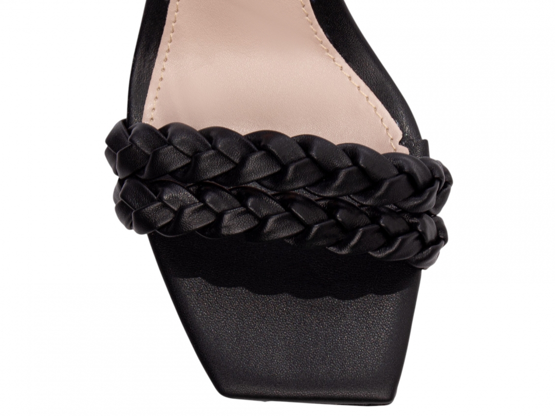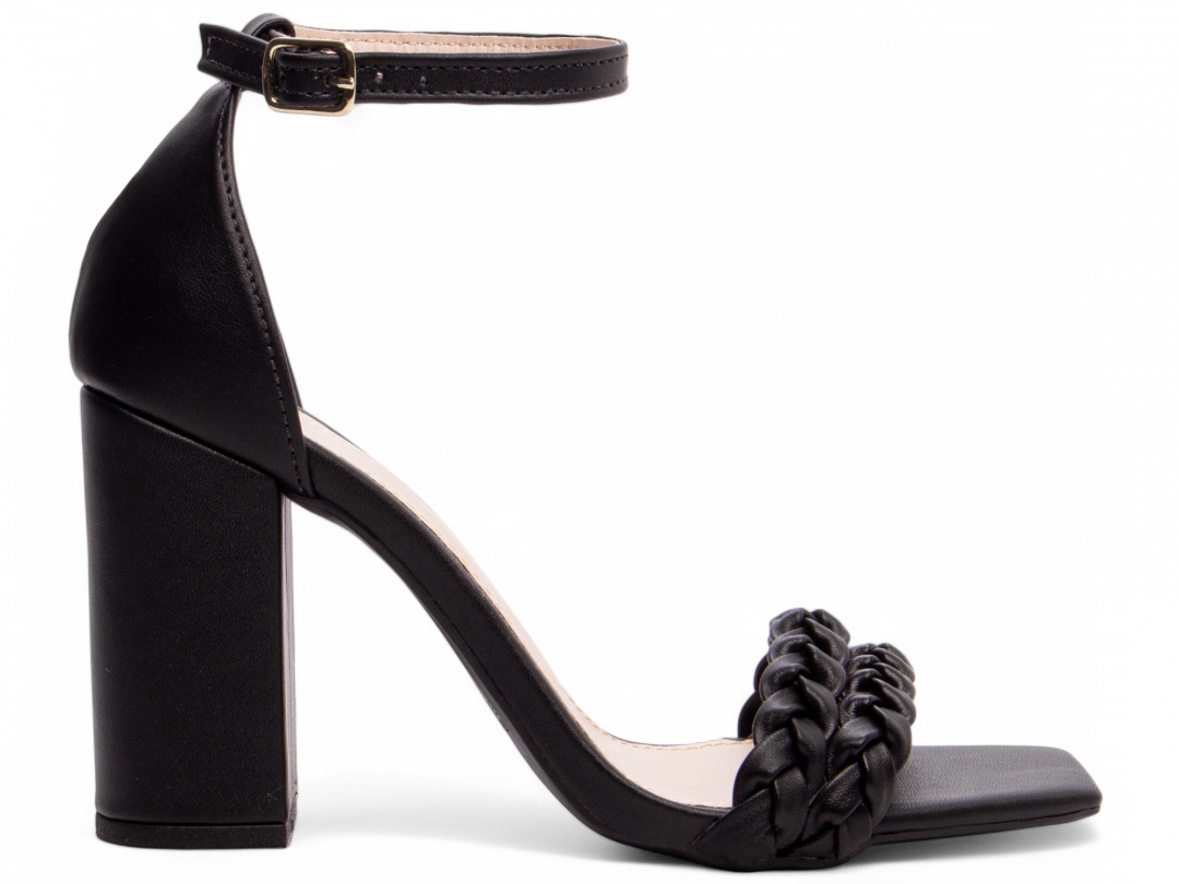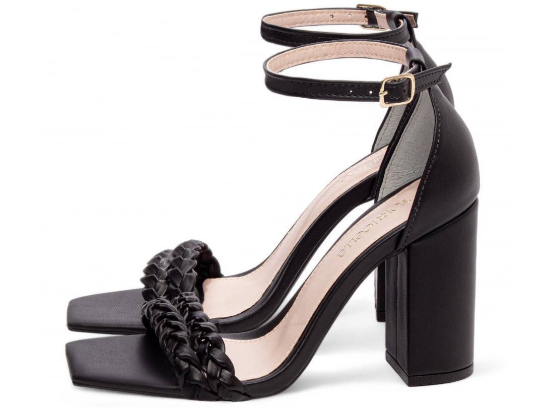 Material: Napa Preto; Enfeite: Tiras trançadas em Napa Preto e fivela de metal na cor dourado; Palmilha: 8 mm de Espessura, Espuma em EVA, Revestida em Napa Preto e Taloneira Napa Bege; Salto: 8,5 cm de Altura e Revestido em Napa Preto; Solado de PVC com antiderrapante na cor Preto.