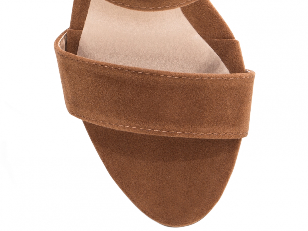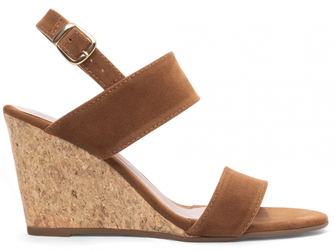 Material: Camurção Caramelo; Enfeite: Fivela de Ajuste na cor Dourado; Palmilha: 4 mm de Espessura, Espuma em EVA, Revestida em Camurção Caramelo e Taloneira Napa Bege; Plataforma: Traseiro/Salto com 7 cm de Altura, Revestido em Cortiça; Solado de PVC na cor Bege.