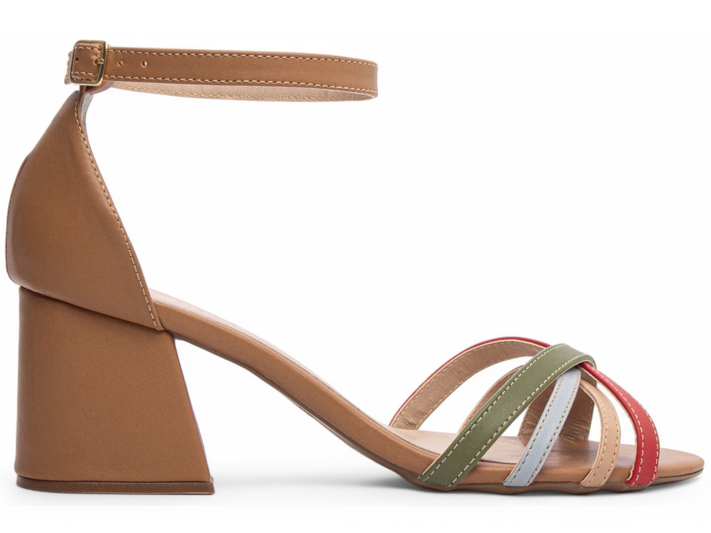 Detalhe em Tiras na Parte Frontal em Napa Vermelho, Natural, Verde e Azul;
