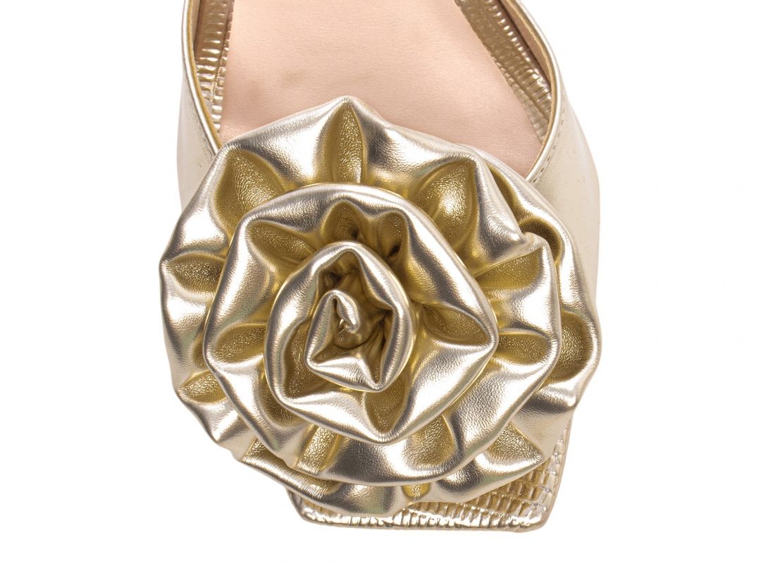 Material: Napa Ouro Ligth / Napa Lezard Ouro Ligth; Enfeite: Flor em Napa Ouro Ligth; Palmilha: 8 mm de Espessura, Espuma em EVA, Revestida em Napa Lezard Ouro Ligth e Taloneira Napa Bege; Salto: Grosso com 9 cm de Altura Revestido em Napa Lezard Ouro Ligth; Solado de TR com antiderrapante na cor Bege.