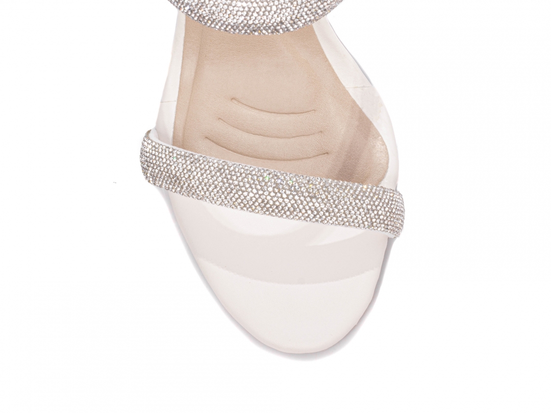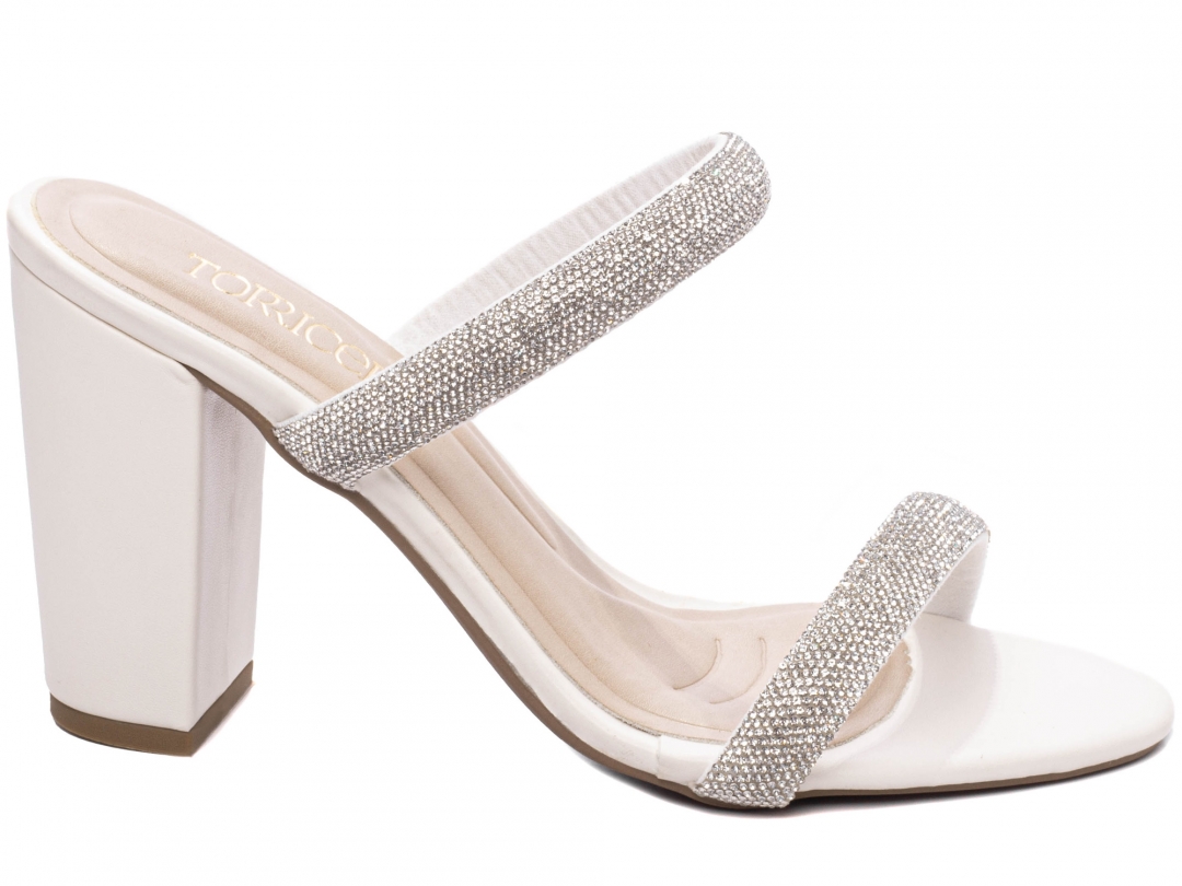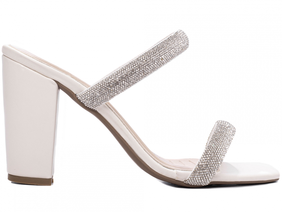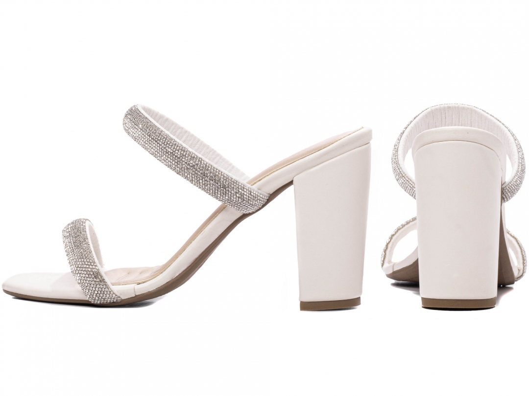 Material: Napa Off White / Manta de Strass na cor Prata; Palmilha: 8 mm de Espessura, Espuma em EVA, Revestida em Napa Off White e Taloneira Napa Bege; Salto: Grosso com 8,5 cm de Altura Revestido em Napa Off White; Solado de PVC com antiderrapante na cor Bege.