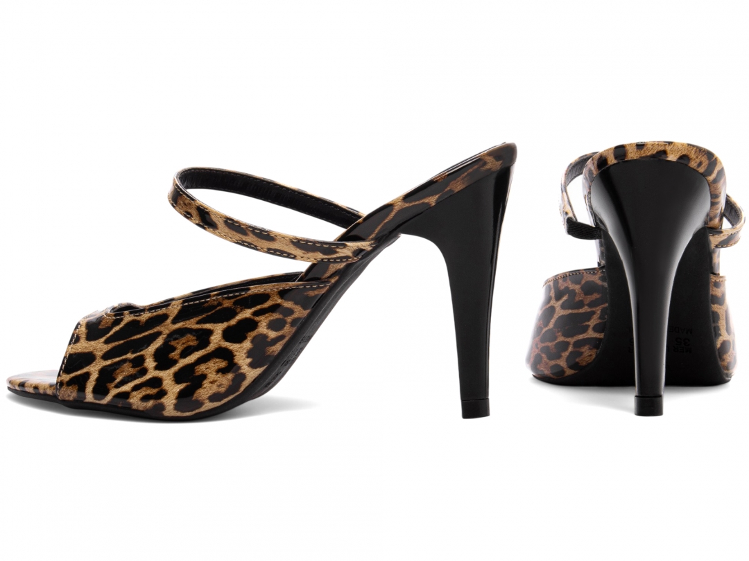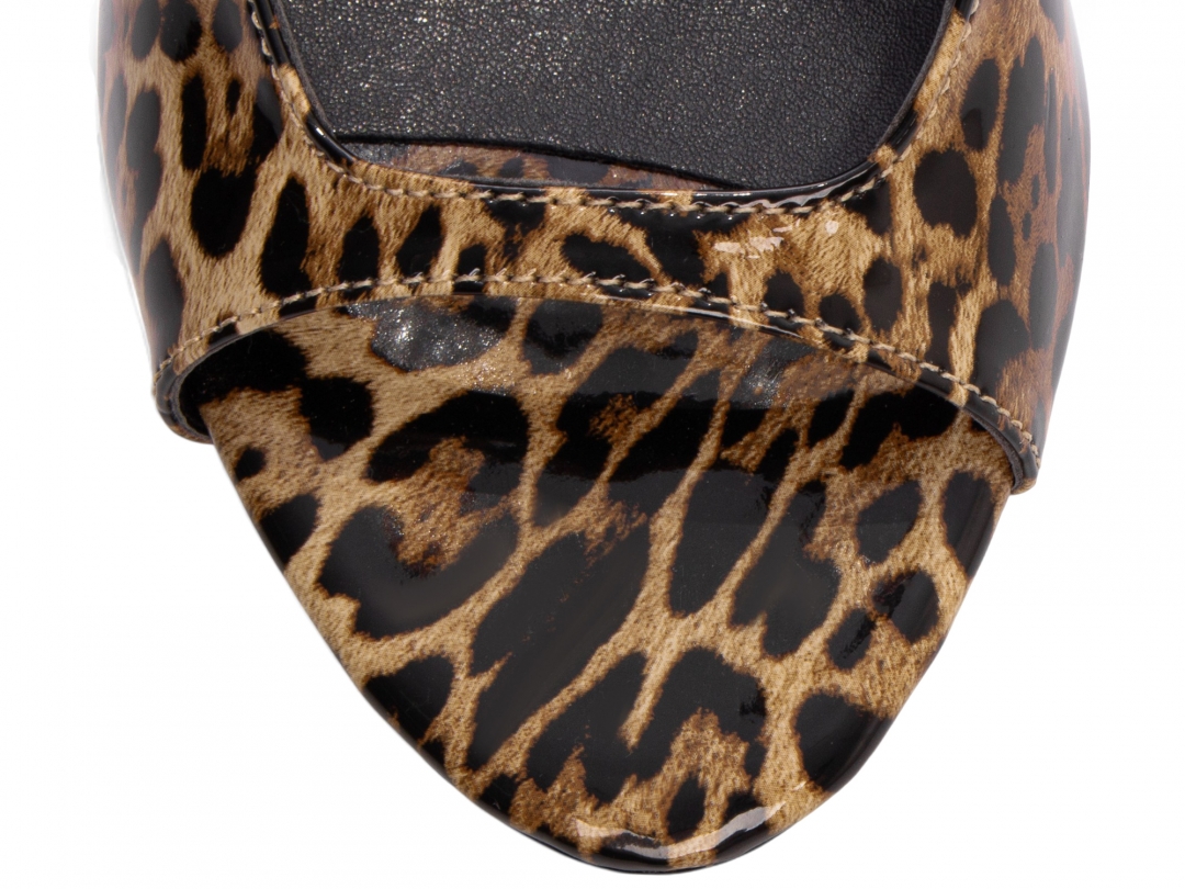 Palmilha: 8 mm de Espessura, Espuma em EVA, Revestida em Verniz estampado Onça e Taloneira Napa Preto;