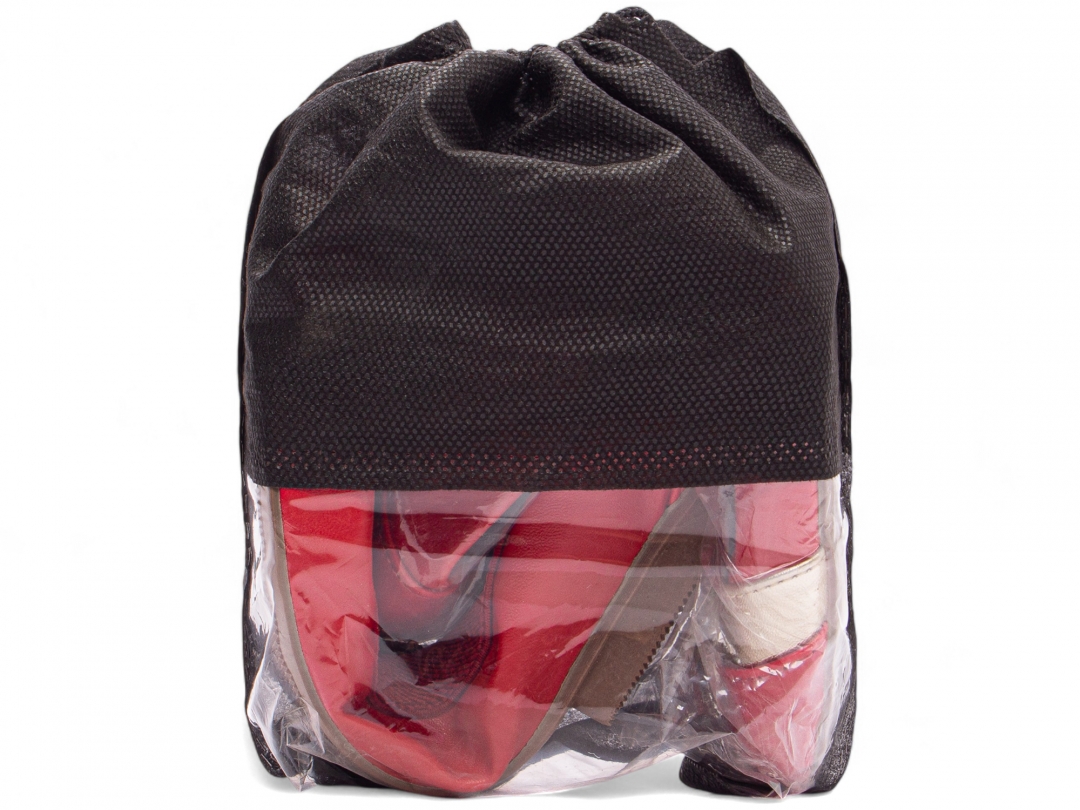 * A sapatilha vai dobrada dentro de um saco de material TNT na cor preto.