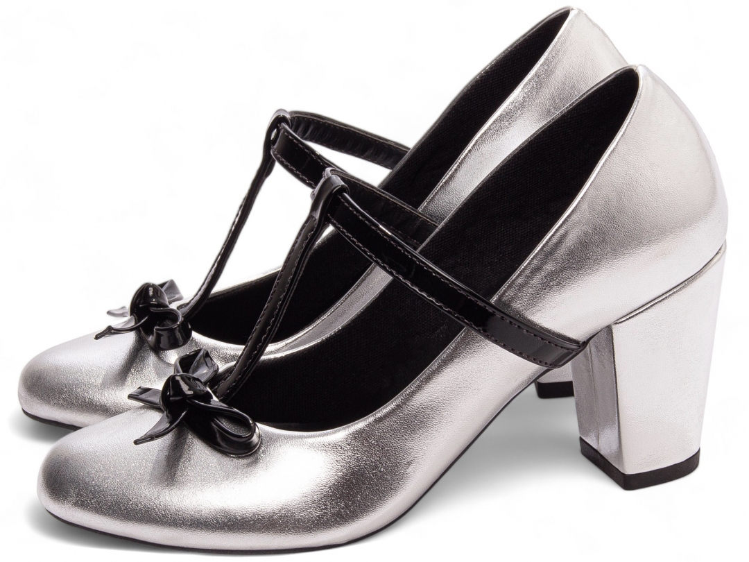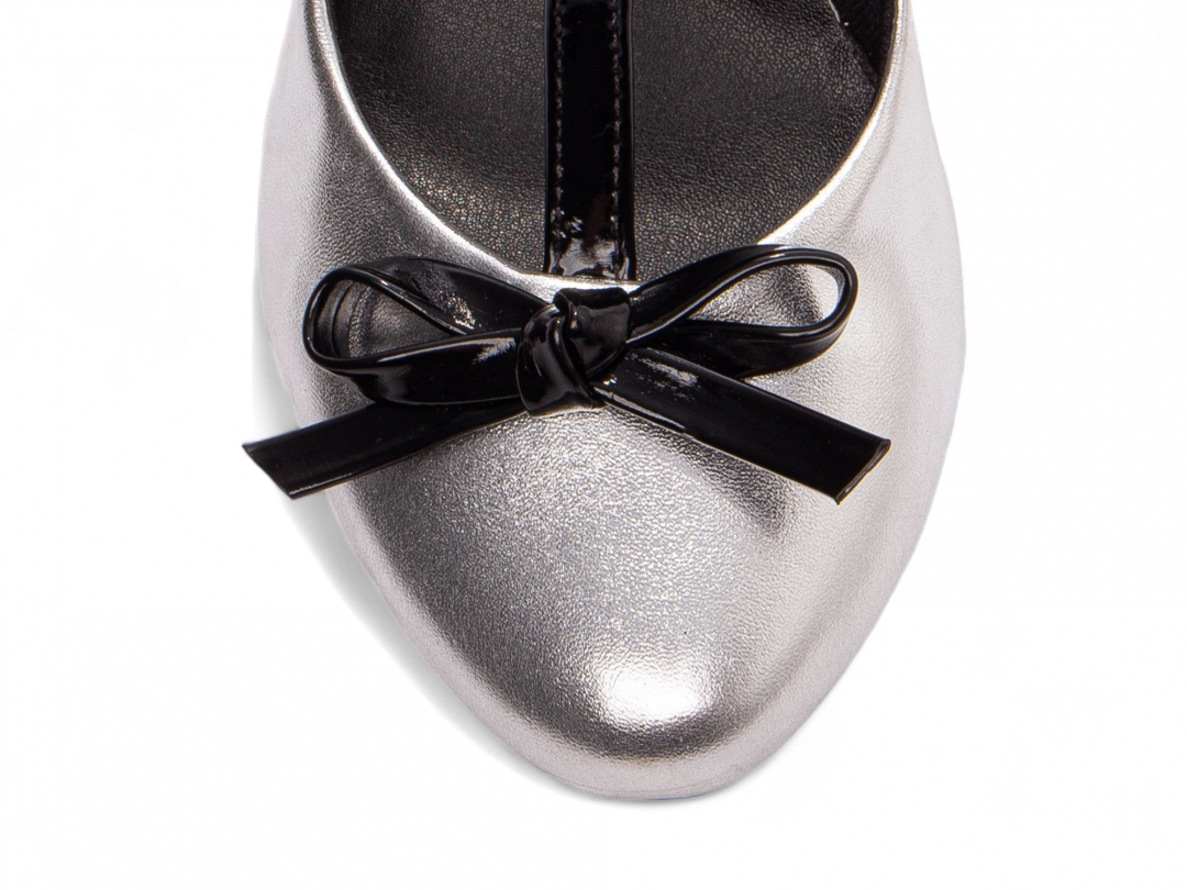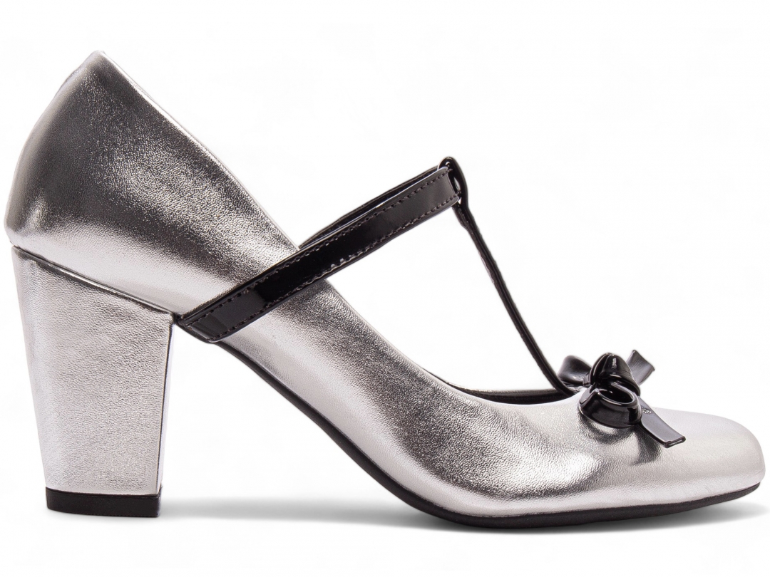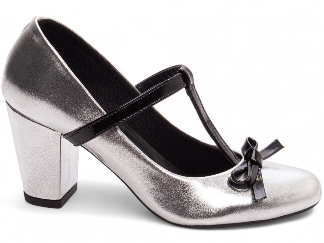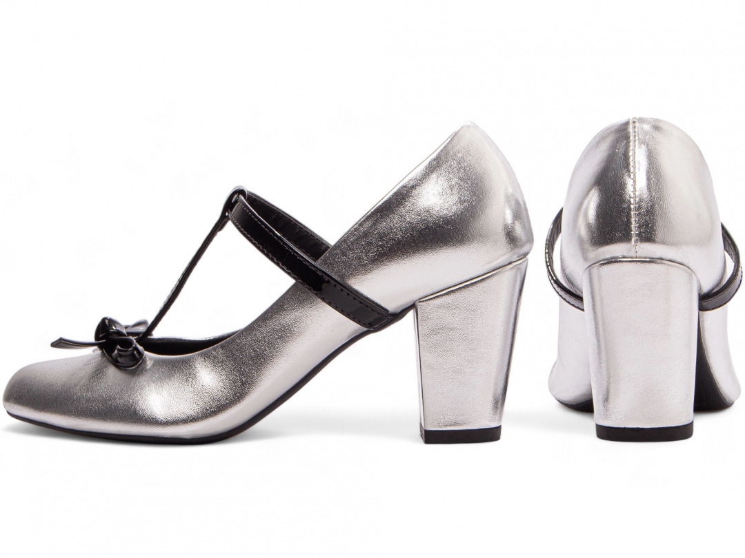 Material: Napa Metalizado Prata e Verniz Preto; Enfeite: Laço em Verniz Preto; Palmilha: com 8 mm de Espessura, Espuma em EVA, e Taloneira Napa Preto; Forro: Cacharrel, material espumado para maior conforto, na cor Preto; Salto: 7 cm de Altura encapado em Napa Metalizado Prata; Solado de PVC antiderrapante na cor Preto.