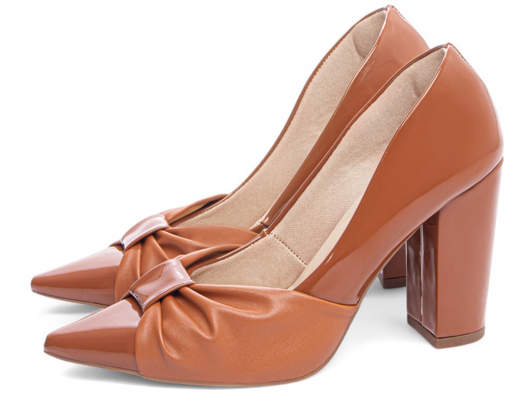 Salto: Grosso com 9 cm de Altura Revestido em Verniz Caramelo;