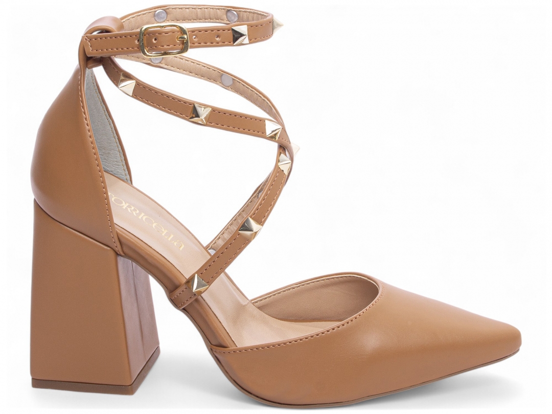 Material: Napa Caramelo; Enfeite: Apliques Pirâmides em ABS na cor Dourado e Fivela de Ajuste na Cor Dourado; Palmilha: 8 mm de Espessura, Espuma em EVA, Revestida em Napa Caramelo e Taloneira Napa Bege; Salto: Grosso com 8,5 cm de Altura Revestido em Napa Caramelo; Solado de PVC com antiderrapante na cor Bege.