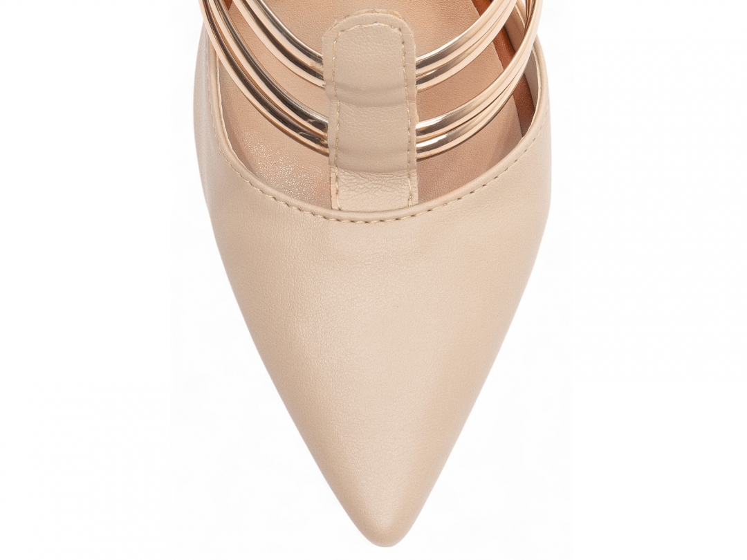 Material: Napa Bege / Napa Caramelo / Metalizado Specchio Ouro Light; Palmilha: 8 mm de Espessura, Espuma em EVA, Revestida em Napa Caramelo e Taloneira Napa Bege; Enfeite: Tiras em Metalizado Specchio Ouro Light; Salto: 9 cm de Altura Revestido em Napa Caramelo; Solado de TR na cor Bege.