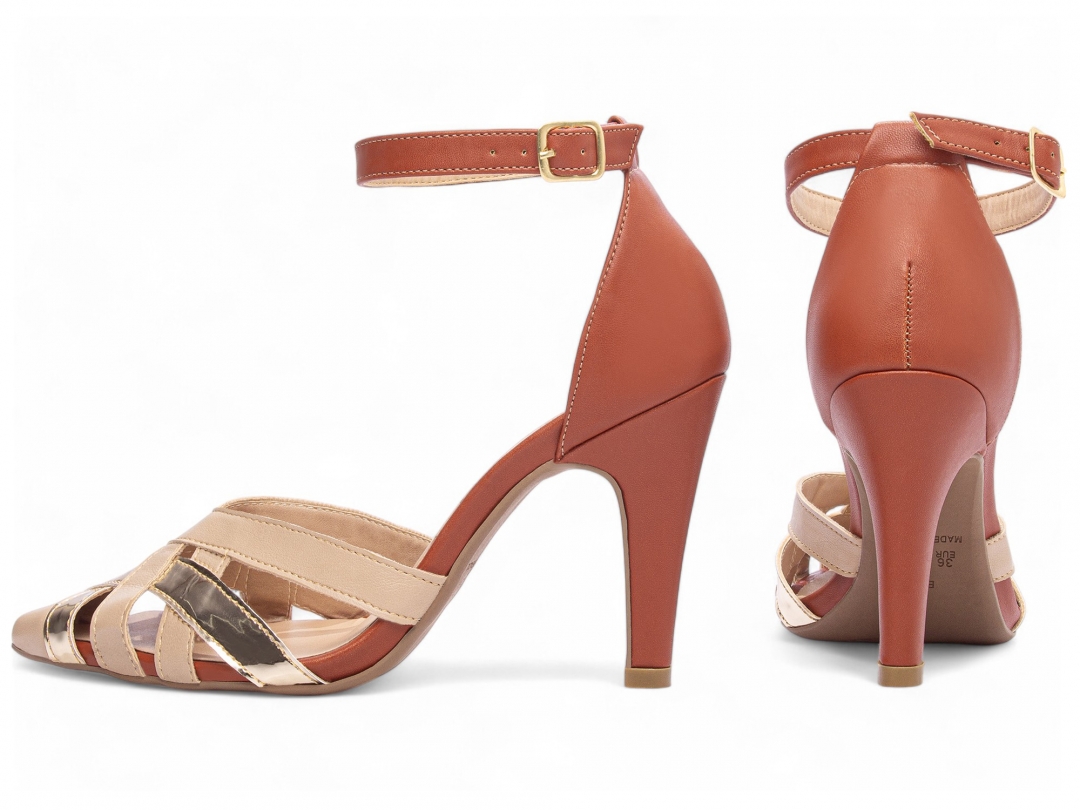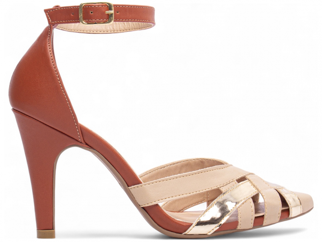 Material: Napa Bege / Napa Caramelo / Metalizado Specchio Ouro Light; Enfeite: Fivela de ajuste na cor Dourado; Forro: Napa na cor Bege; Palmilha: 8 mm de Espessura, Espuma em EVA Revestida em Napa Caramelo e Taloneira Napa Bege; Salto: Fino com 9 cm de Altura Revestido em Napa Caramelo; Solado de PVC com antiderrapante […]