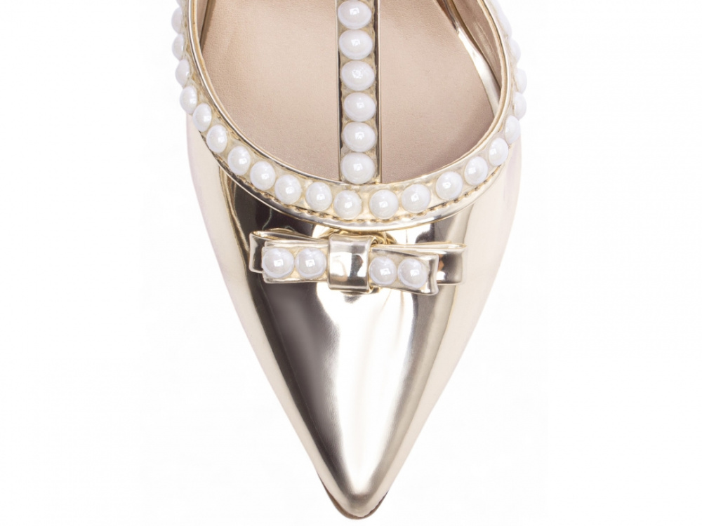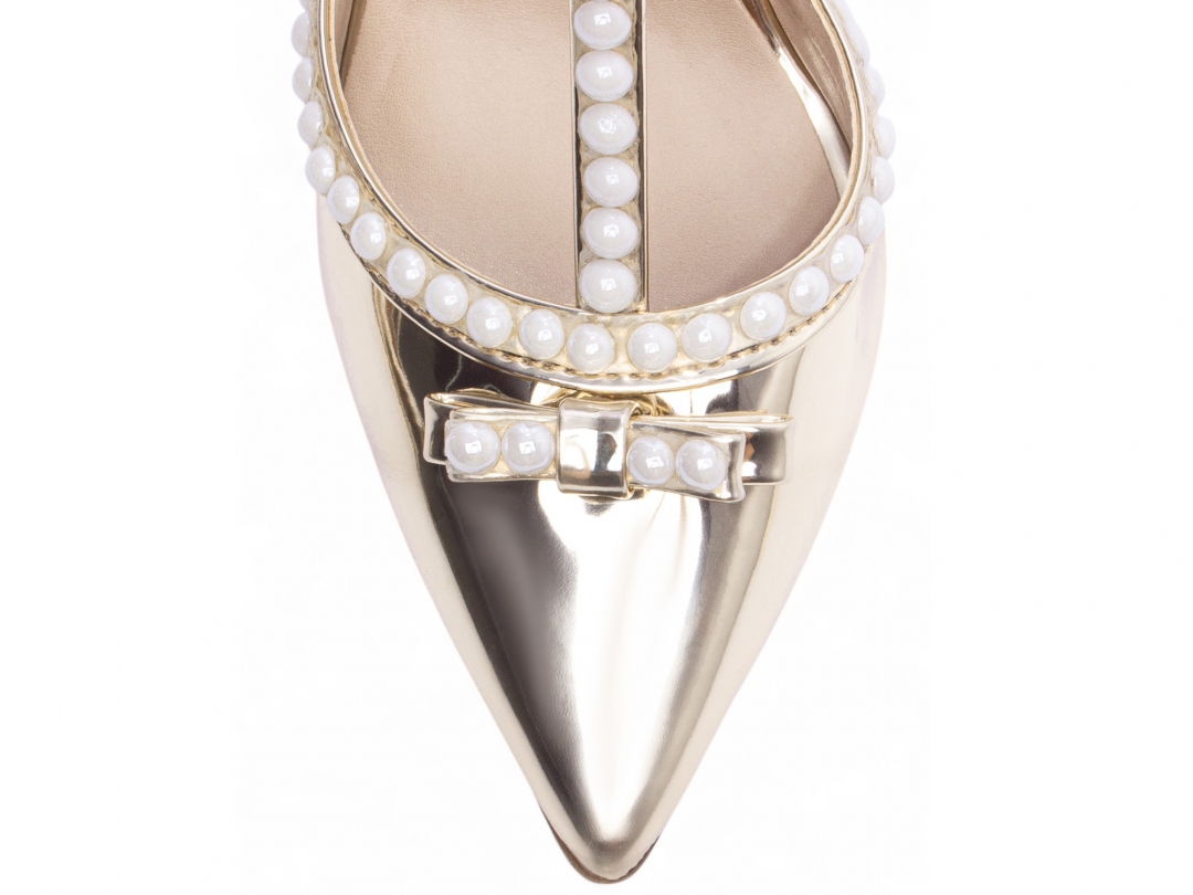 Material: Verniz Metalizado Specchio Ouro Light; Palmilha: 8 mm de Espessura, Espuma em EVA, Revestida em Metalizado Speechio Ouro Light e Taloneira Napa Bege; Enfeite: Pérola em ABS; Salto: 9 cm de Altura Revestido em Metalizado Speechio Ouro Light; Solado de Micro na cor Bege.