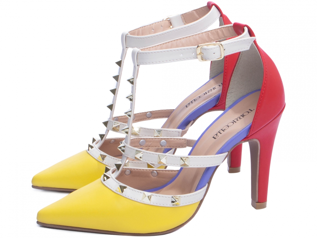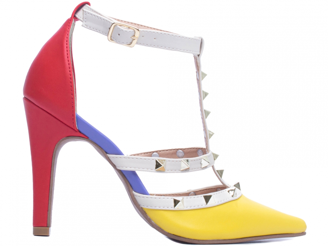 Material: Napa Vermelho / Napa Amarelo / Napa Off White; Palmilha: 8 mm de Espessura, Espuma em EVA, Revestida em Napa Roxo e Taloneira Napa Bege; Enfeite: Pirâmide Dourado; Salto: 9 cm de Altura Revestido em Napa Vermelho; Solado de TR coletado na cor Bege.