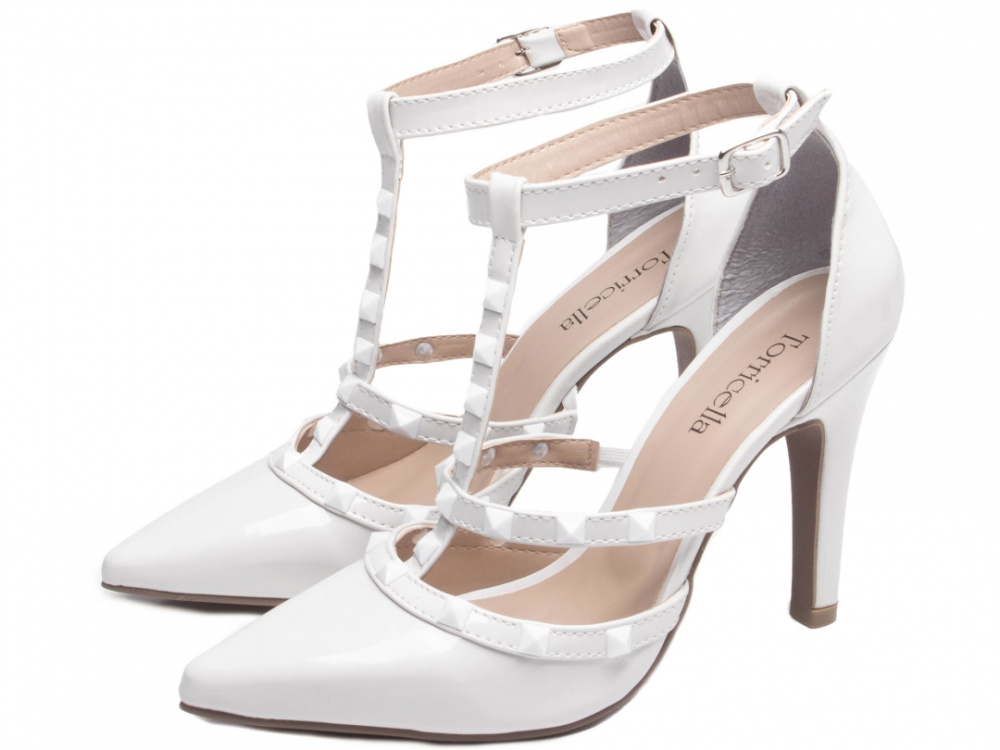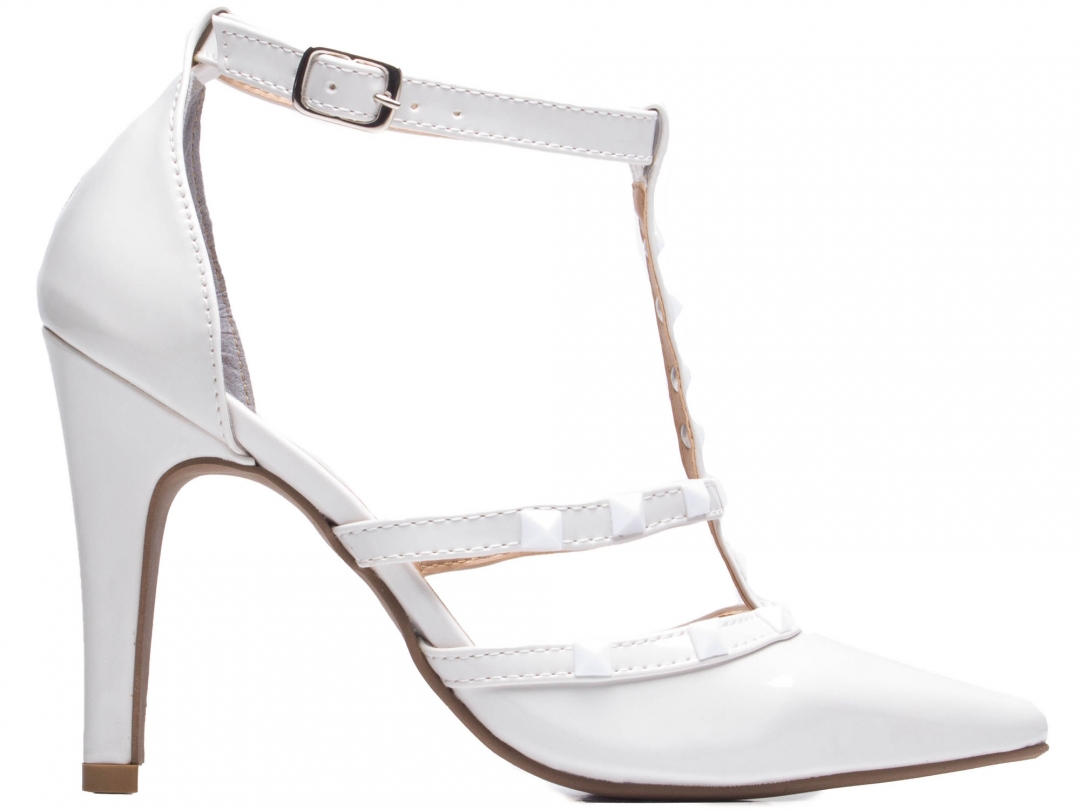 Material: Verniz Off White; Palmilha: 8 mm de Espessura, Espuma em EVA, Revestida em Verniz Off White e Taloneira Napa Bege; Enfeite: Pirâmide Branco; Salto: 9 cm de Altura Revestido em Verniz Off White; Solado de TR coletado na cor Bege.