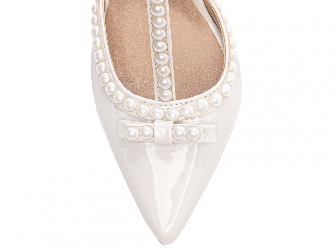 Material: Verniz Off White; Palmilha: 8 mm de Espessura, Espuma em EVA, Revestida em Verniz Off White e Taloneira Napa Bege; Enfeite: Pérola em ABS; Salto: 9 cm de Altura Revestido em Verniz Off White; Solado de TR na cor Bege.