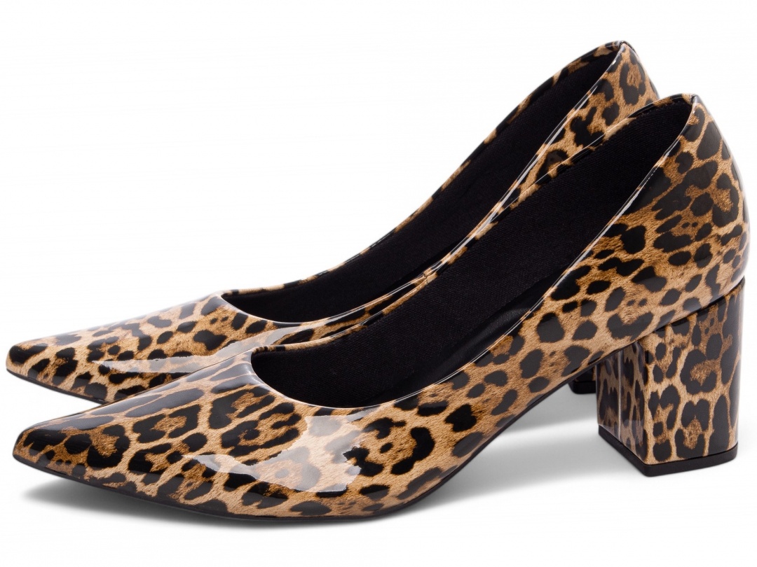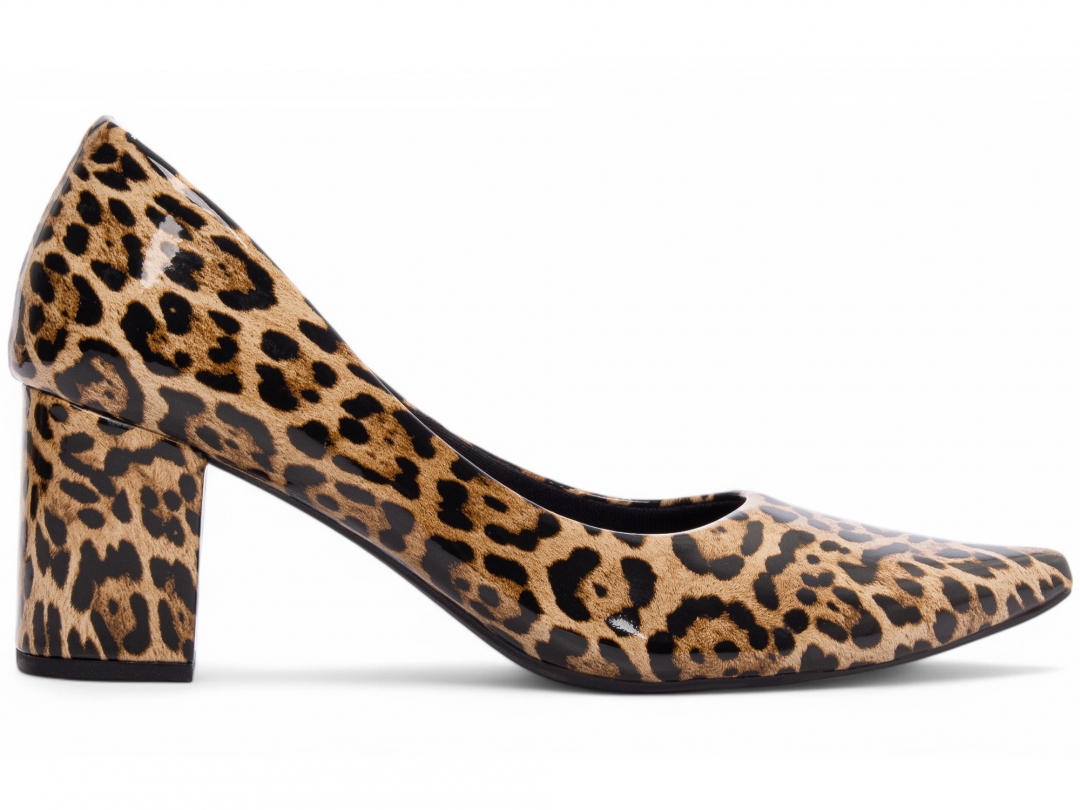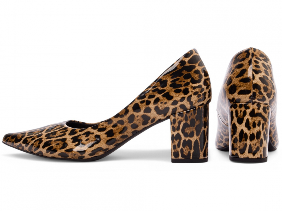 Material: Verniz Onça; Palmilha: 8 mm de Espessura, Espuma em EVA, e Taloneira Napa Preto; Forro: Cacharrel, material espumado para maior conforto na cor Preto; Salto: 6,5 cm de Altura encapado em Verniz Onça; Solado de PVC na cor Preto.