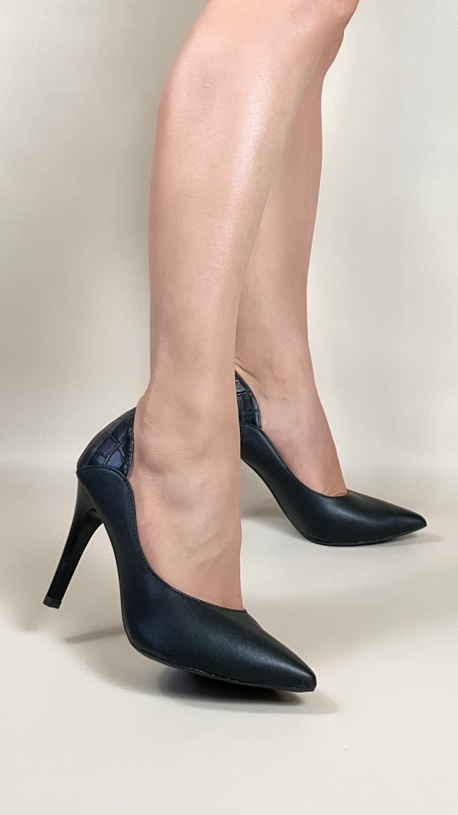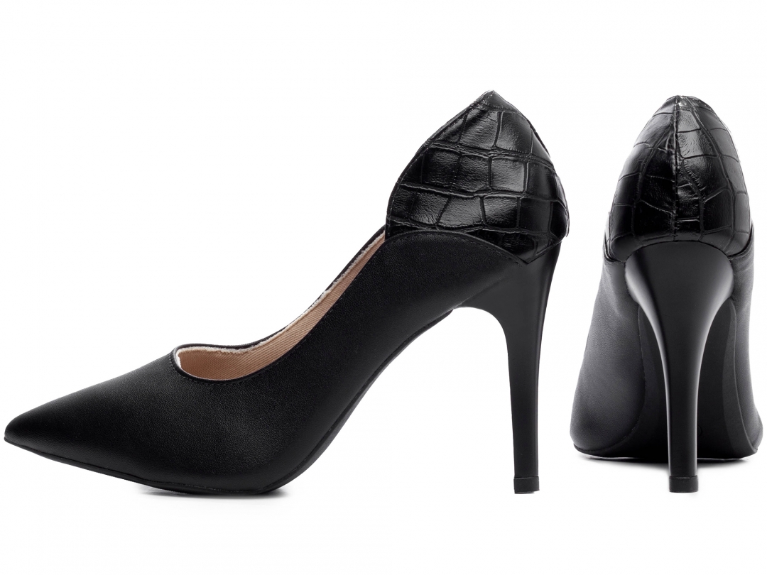Material: Napa Preto e Croco Preto; Palmilha: Confort com 8 mm de Espessura, Espuma em EVA, Revestida com Napa Preto e Taloneira Napa Bege; Forro: Cacharrel, material espumado para maior conforto, na cor Bege Claro; Salto: 10 cm de Altura pintado na cor Preto; Solado de PVC antiderrapante na cor Preto.
