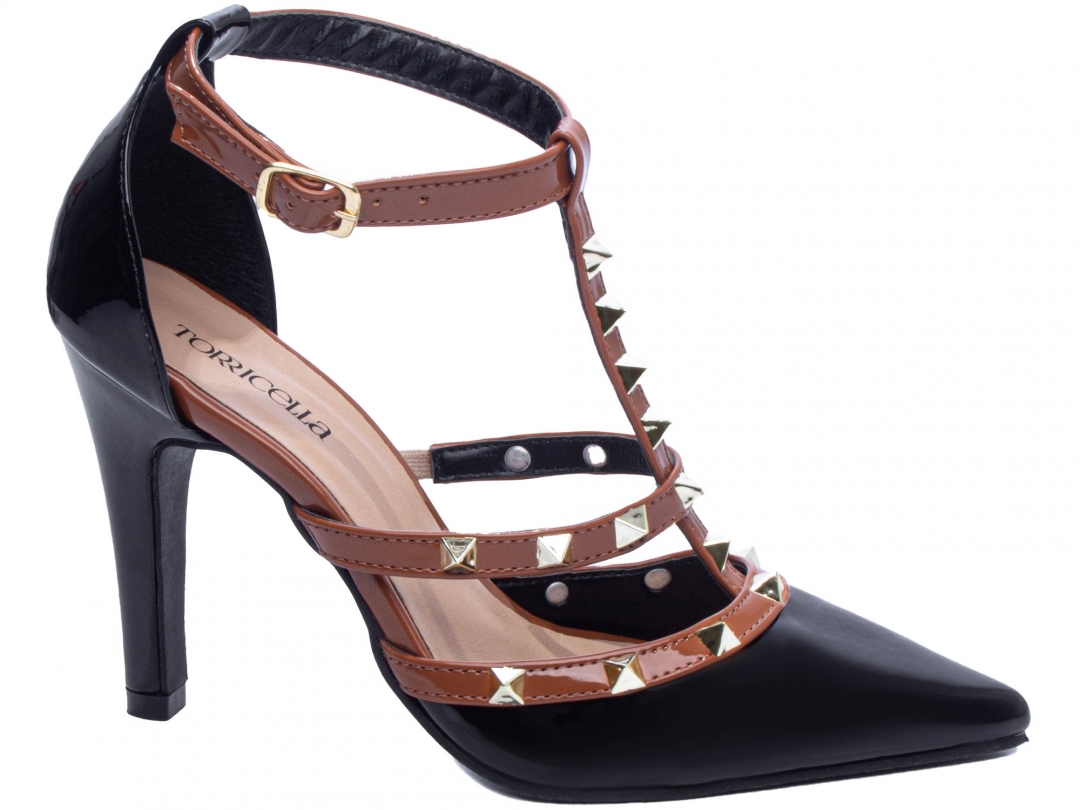 Material: Verniz Preto / Verniz Marrom; Palmilha: 8 mm de Espessura, Espuma em EVA, Revestida em Verniz Marrom e Taloneira Napa Bege; Enfeite: Pirâmide Dourado; Salto: 9 cm de Altura Revestido em Verniz Preto; Solado de TR coletado na cor Preto.