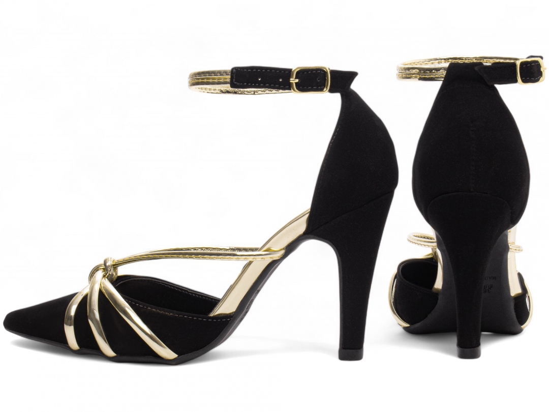 Material: Nobuck Preto / Metalizado Speechio Ouro Light; Enfeite: Fivela de Ajuste na Cor Dourado; Palmilha: 8 mm de Espessura, Espuma em EVA, Revestida em Metalizado Speechio Ouro Light e Taloneira Napa Preto; Salto: Fino com 9 cm de Altura Revestido em Nobuck Preto; Solado de PVC com antiderrapante na cor Preto.