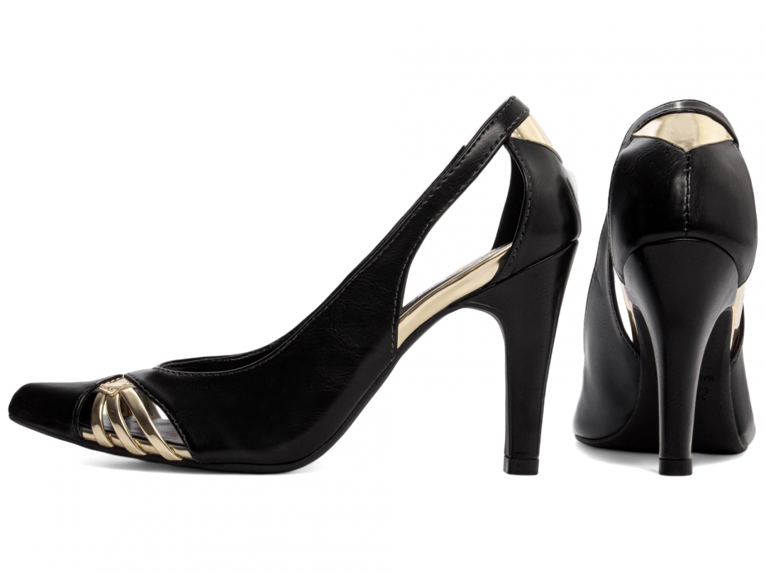 Material: Napa Preto / Metalizado Speechio Ouro Light; Palmilha: 8 mm de Espessura, Espuma em EVA, Revestida em Metalizado Speechio Ouro Light e Taloneira Napa Preto; Salto: Fino com 9 cm de Altura Revestido em Napa Preto; Solado de PVC com antiderrapante na cor Preto.