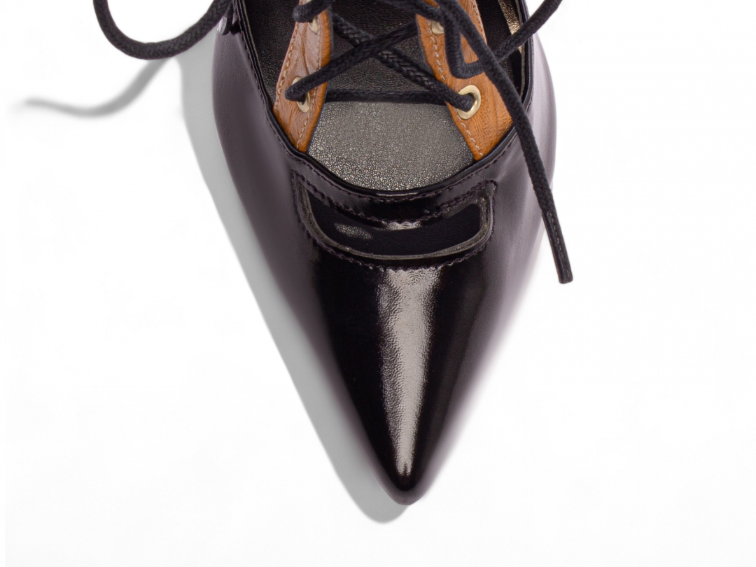 Material: Napa Preto e Napa Vintage Caramelo; Enfeite: Cordão na cor preto e Ilhós Dourado; Palmilha: 8 mm de Espessura, Espuma em EVA, Revestida em Napa Dourado e Taloneira Napa Preto; Forro: Napa Sintético, na cor Preto; Salto: 12 cm de Altura e Revestido em Croco Caramelo; Solado em Micro na cor Preto.